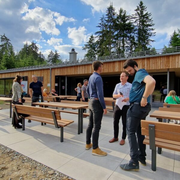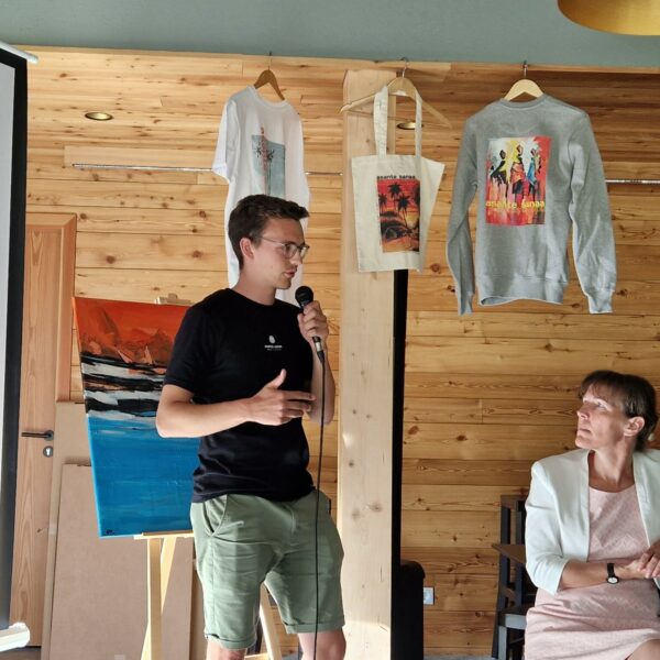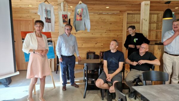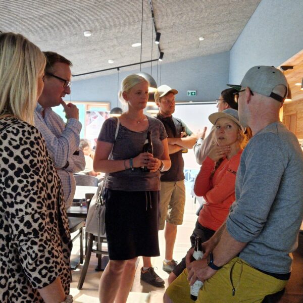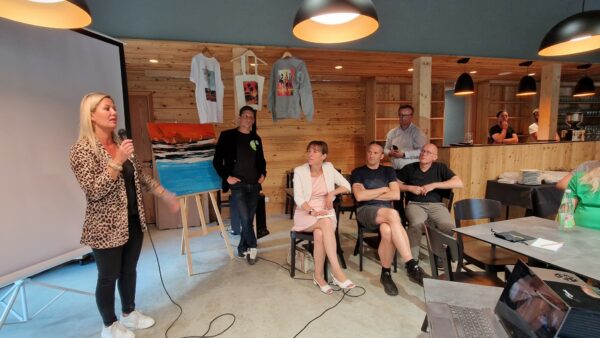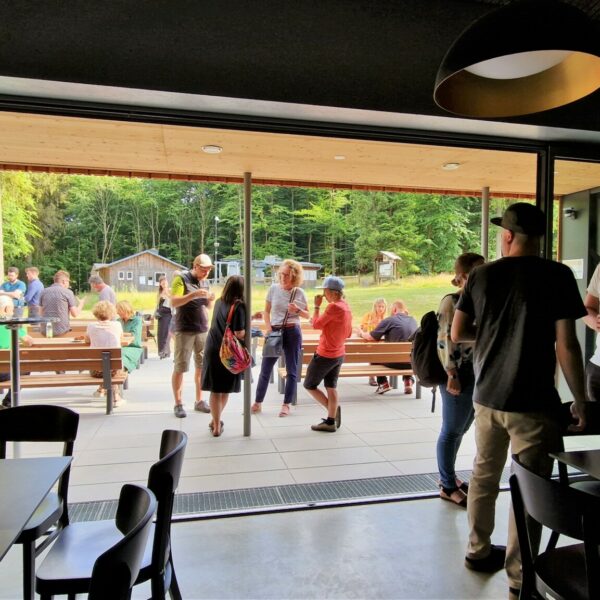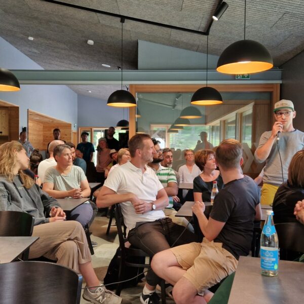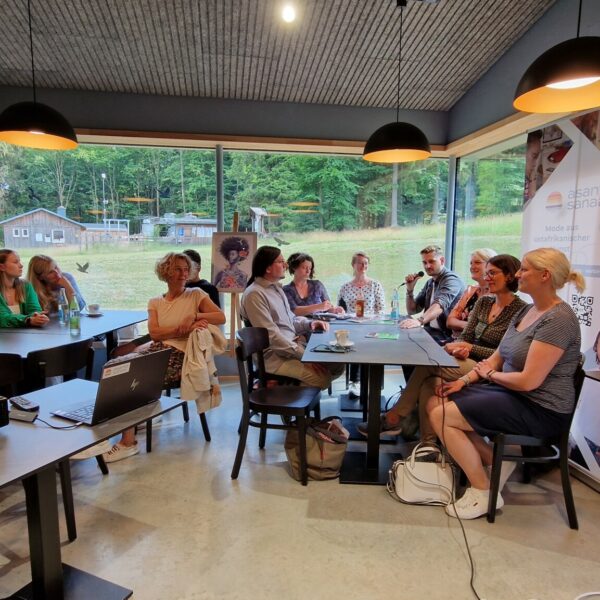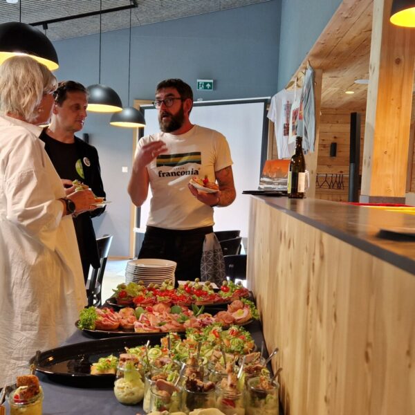 Als ein Projekt, das bereits im Entstehen ist, stellte etwa Sabine Gollner von der KÜKO – Künstlerkolonie Fichtelgebirge nach ersten positiven Erfahrungen im Fichtelgebirge nun ein neues Konzept in Zusammenarbeit mit der Stadt Hof vor, das innerstädtische Leerstände kreativ zu nutzen und beleben will. Alexander Popp, Wirtschaftsförderer des Landkreises Wunsiedel, und Finn Regenhold, im Landkreis zuständig für die Kreativwirtschaft, kündigten zudem ein Barcamp für Kreative an, das sich in Planung befindet. Als Beispiel für ein kreatives, neues Geschäftsmodell war Gründer Jan Schultheis eingeladen, um sein sozialwirtschaftliches Start-up „Asante Sanaa“ vom Bayreuther „StartUp Point“ vorzustellen. Ziel des Unternehmens ist es, Künstlerinnen und Künstler aus Ostafrika zu unterstützen, indem es ihnen einen Marktplatz für ihre Kunst bietet. Anschließend stand der Austausch untereinander im Vordergrund, was von den Teilnehmern rege genutzt wurde, die sich an diesem Sommerabend zudem auch vom modernen, entspannten Ambiente des neuen Kornberghauses begeistert zeigten.