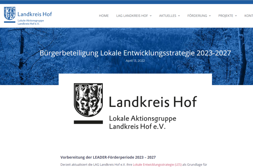 Zur Bürgerbeteiligung als Vorbereitung für den nächsten Förderzeitraum geht es hier: https://www.lag-landkreis-hof.de/buergerbeteiligung-les-2023-27/