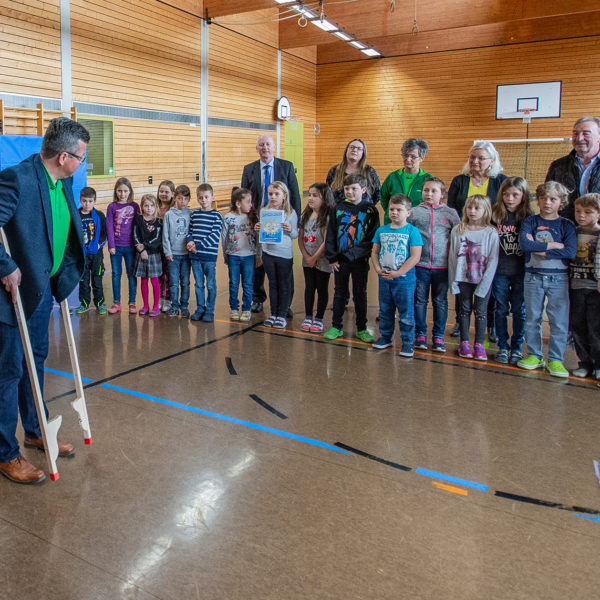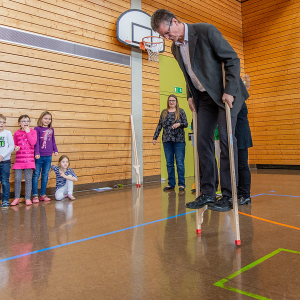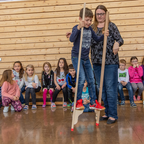 „In jedem steckt ein Superheld!“, so lautet das Motto von Adi und Adine. Mit der Geschichte der Helden Adi und Adine sollen Kinder frühzeitig spielerisch lernen, wie man sich mit Sport, gutem Essen und Trinken, stark fühlt und auch gesund bleibt. So soll der steigenden Zahl adipöser Kinder nachhaltig entgegengewirkt werden. Mehrere Schulen aus dem Landkreis Hof haben an dem Projekt teilgenommen. In der Von-Pühel-Grundschule Tauperlitz hat Klaus Tröger von der Gesundheitsregion plus Stadt und Landkreis Hof Geschenke an die teilnehmenden Schulklassen übergeben, natürlich zur körperlichen Betätigung: mit je zwei Paar Holzstelzen.