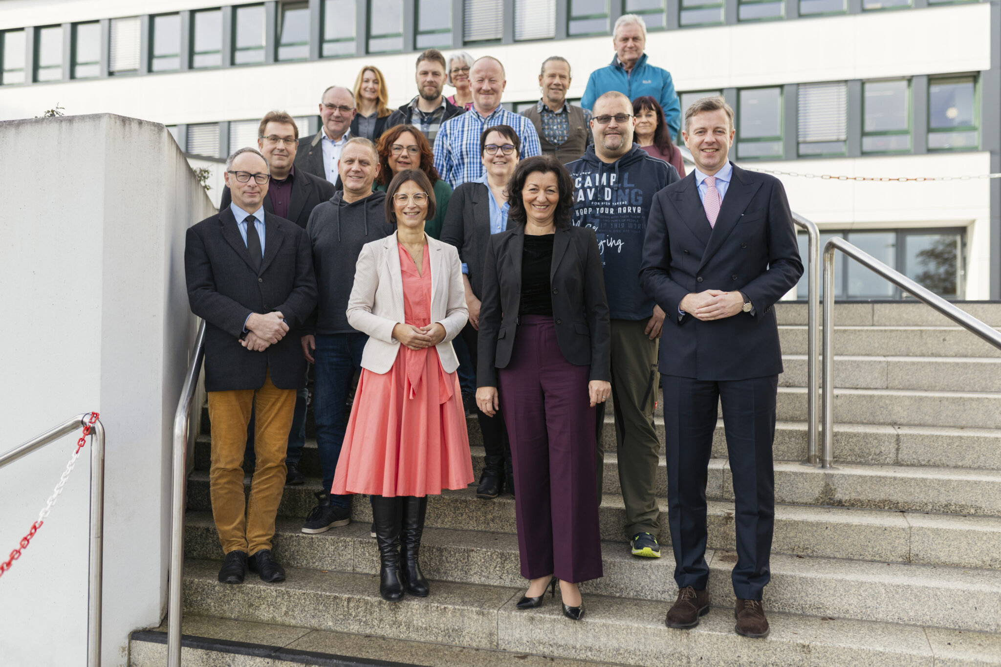 Von links in der 1. Reihe: Bertram Popp, Regierungsdirektorin Katrin von Mammen, Christine Schmölzer-Glier und Landrat Dr. Oliver Bär. In der 2. Reihe: Christian Frank, Holger Lörner, Regina Popp, Michaela Wunderlich und Holger Welte. In der 3. Reihe: Andreas Arnold, Personalleiterin Daniela Schreiner, Christian Haber, Personalratsvorsitzende Gabriele Roth, Christoph Saalfrank, Stefan Fütterer, Roland Weber und Carmen Schatz.