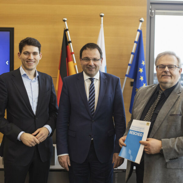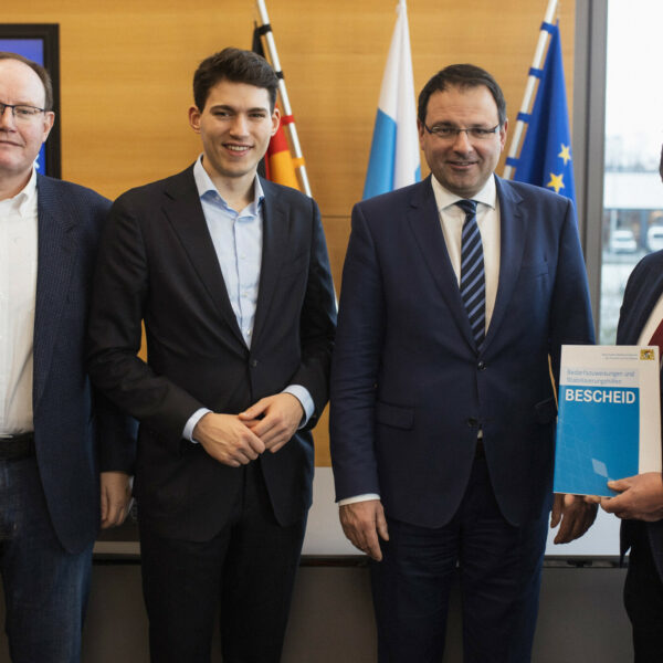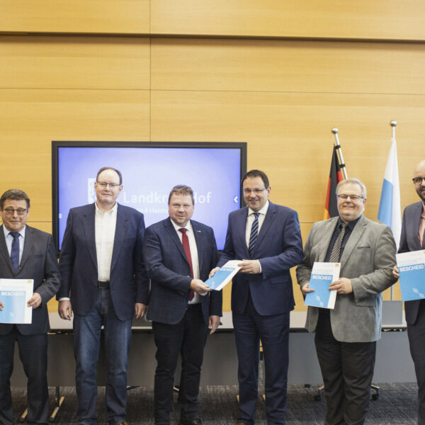 Martin Schöffel, Staatssekretär im Bayerischen Staatsministerium der Finanzen und für Heimat, hat im Rahmen eines Besuches im Landratsamt Hof die entsprechenden Bescheide an Landrat Dr. Oliver Bär sowie die Bürgermeister von Gattendorf, Naila, Schauenstein und Schwarzenbach am Wald übergeben.