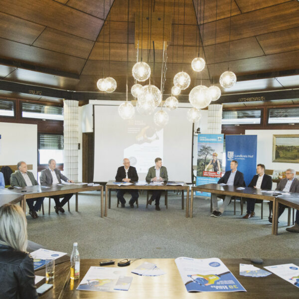 Bei der Pressekonferenz (von links): Anja Naumann, Hermann Seiferth, Alexander Künzl (alle vom Organisationsteam am Landratsamt), Bürgermeister Marc Ultsch (Döhlau), Bürgermeister Stefan Breuer (Oberkotzau), Landrat Dr. Oliver Bär, Bürgermeister Matthias Beyer (Köditz), Bürgermeister Heiko Hain (Weißdorf), Bürgermeisterin Patricia Ruber (Berg), Bürgermeister Hans-Peter Baumann (Schwarzenbach a.d.S.), Bürgermeister Horst Penzel (Zell i.F.)