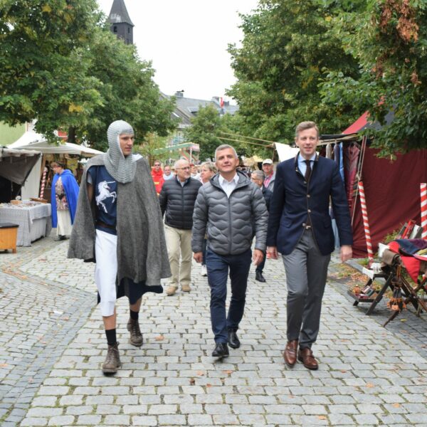 Bei einem Ausflug in den Landkreis Bayreuth traf die Delegation Landrat Florian Wiedemann und besuchte die Teufelshöhle Pottenstein, die vor 100 Jahren entdeckt worden war. Im Hofer Land wurde neben der historischen Kirche in Joditz, geführt von Kreisheimatpfleger Bertram Popp, auch das Haus Marteau in Lichtenberg mit seinem neuen Konzertsaal, geführt von Dr. Ulrich Wirz vom Bezirk Oberfranken, besichtigt. Auch das Burgfest in Lichtenberg besuchten die Gäste, ebenso wie den Kreisgartentag in Leupoldsgrün, wo die Delegation mit einem eigenen Stand vertreten war, an dem sie über ihren Landkreis in den Westmasuren informierten.