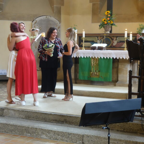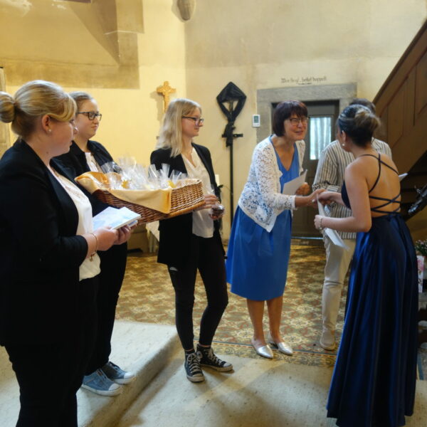 Nach dem offiziellen Teil der Abschlussfeier in der Kirche in Ahornberg, ließen die Absolventinnen und Absolventen, Lehrkräfte, Eltern und Freunde den Nachmittag bei Getränken und Häppchen in der Aula der Schule ausklingen.