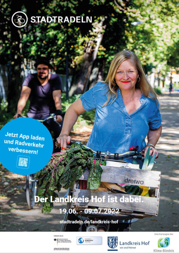 Zudem sei auf die STADTRADELN Auftaktveranstaltung in der Hofer Innenstadt am Sonntag, den 19. Juni 2022, hingewiesen. Verschiedene Straßen der Innenstadt werden dann für den Kfz-Verkehr gesperrt. Fahrräder, Roller, Inliner etc. können sich frei bewegen. Es warten viele Stände, Mitmachstationen und spannende Aktionen. Auch das Klimaschutzmanagement des Landkreises Hof ist mit einem Stand vertreten. Schauen Sie einmal bei uns auf der Ludwigstraße, Nähe Rathaus, vorbei.