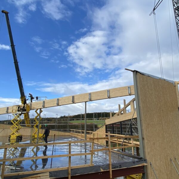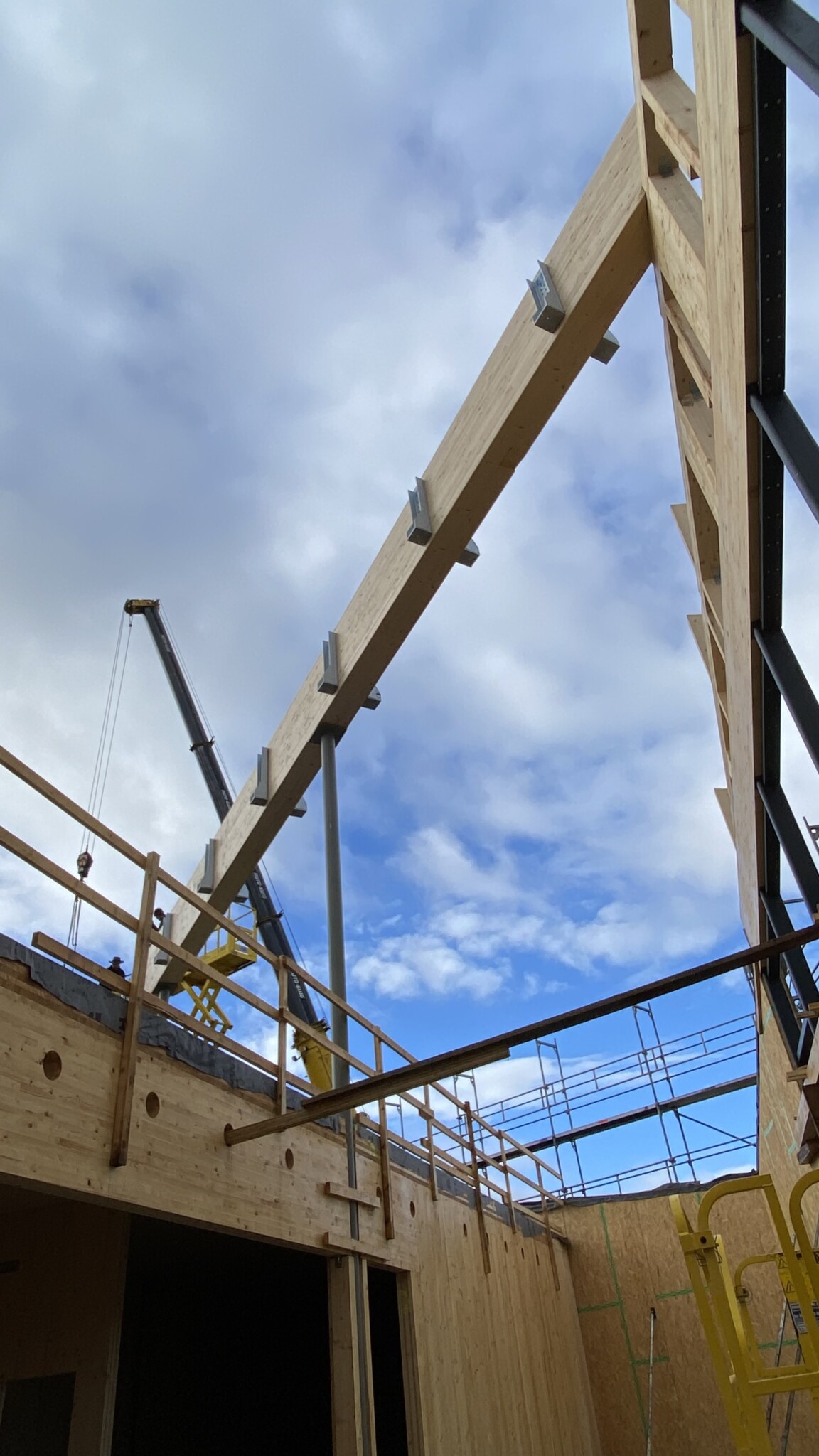 Auf der Baustelle des Deutsch-Deutschen Museums in Mödlareuth geht es weiter voran. Der Neubau in Holzbauweise nimmt kontinuierlich Gestalt an. Nun wurde mit Hilfe von zwei Kränen der großer Hauptträger des Daches montiert. Bis Ende 2023 soll der erste Abschnitt des Holzbaus fertiggestellt und somit die Gebäudehülle geschlossen sein. Als Nächstes folgen ab Ende des Monats Abdichtungsarbeiten. Anfang 2024 soll mit dem Innenausbau begonnen werden. Parallel dazu starten die Rohinstallationen der Haustechnik. Ab März nächsten Jahres stehen Arbeiten im Außenbereich an.