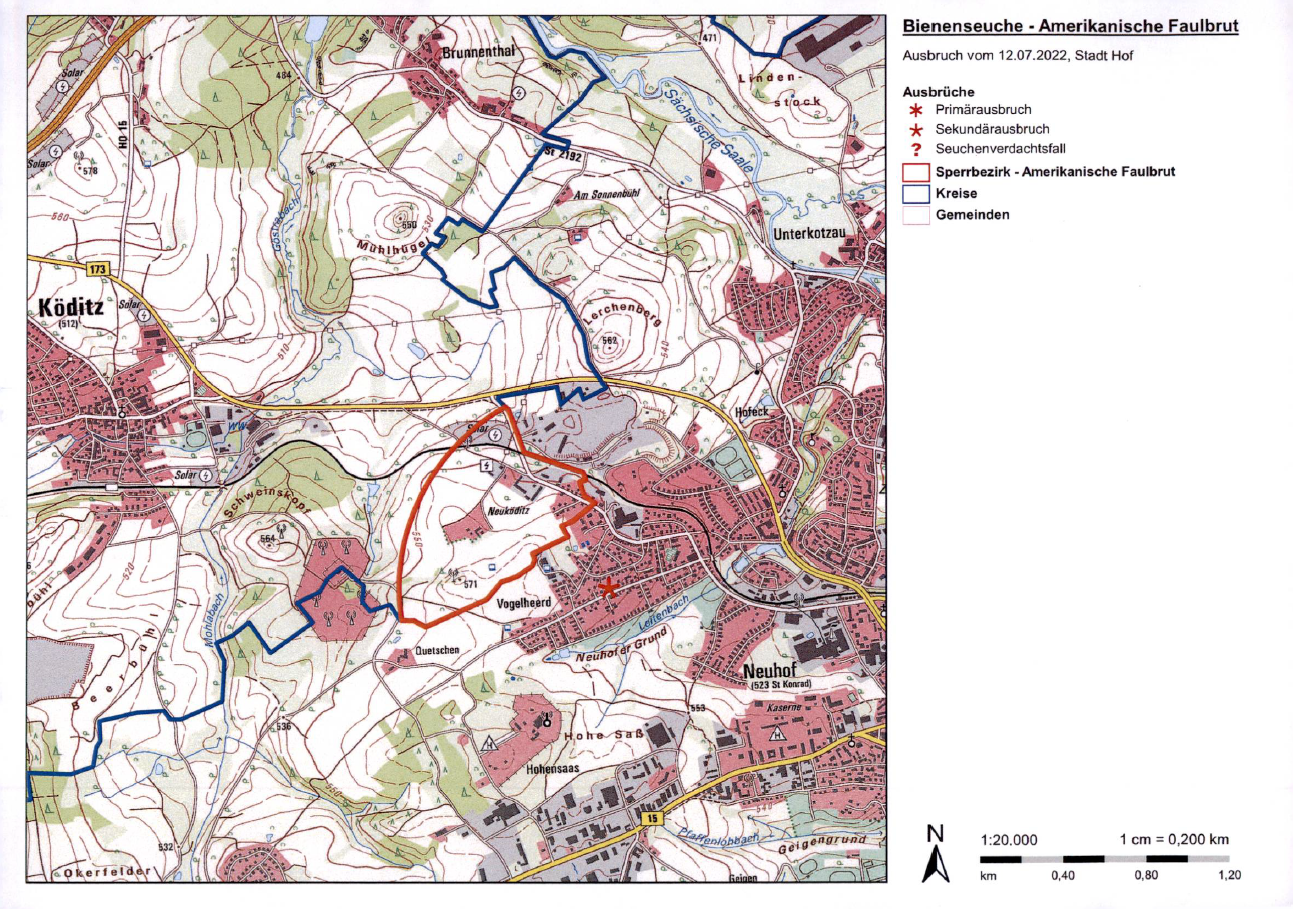 Der Sperrbezirk, der per Allgemeinverfügung vom 18.07.2022 zur Bekämpfung der Amerikanischen Faulbrut der Bienen im Gebiet des Landkreises Hof (s. Lageskizze sowie damalige Mitteilung unter Allgemeinverfügung: Bekämpfung der Bienenseuche „Amerikanische Faulbrut“ – Landkreis Hof (landkreis-hof.de)), festgelegt worden war, wird aufgehoben, weil der Ausbruch der Amerikanischen Faulbrut der Bienen als erloschen gilt (§ 12 Abs. 2 und 3 Bienenseuchen-Verordnung).
