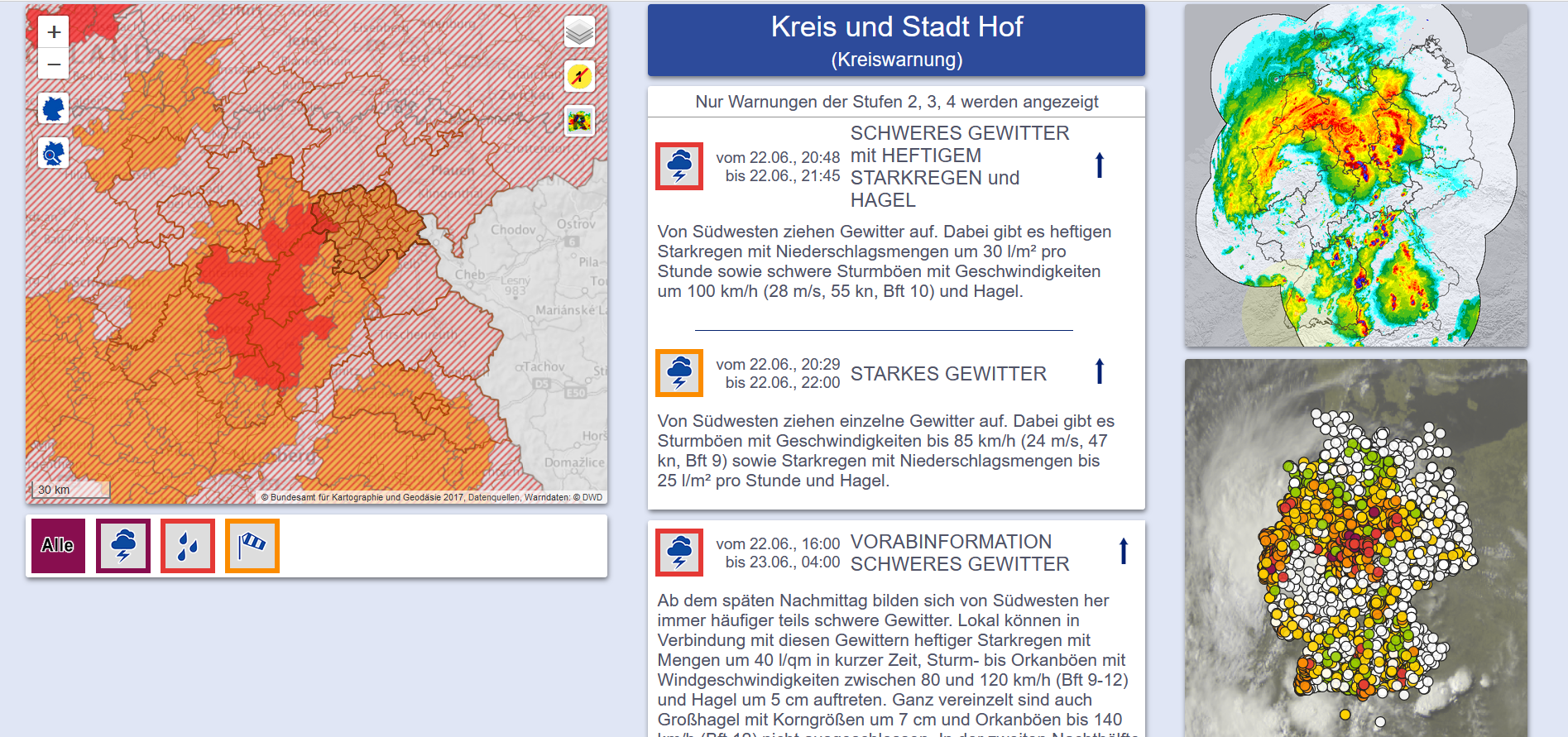 Der Deutsche Wetterdienst warnt für Stadt und Landkreis Hof vor starkem Gewitter bzw. schwerem Gewitter mit Starkregen und Hagel, nach aktuellem Stand beginnend um ca. 21 Uhr.