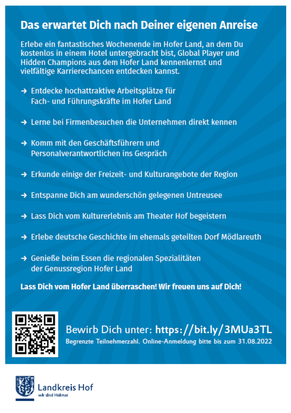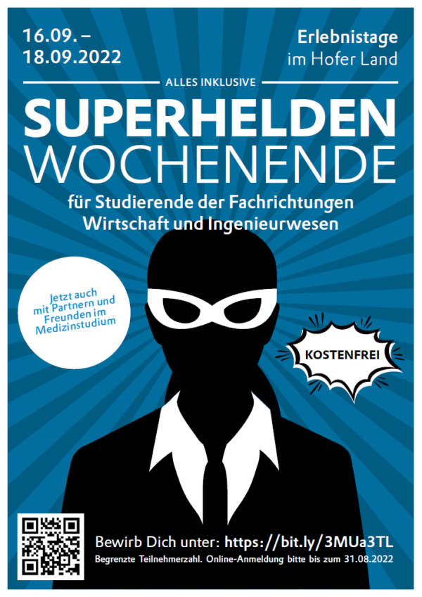 Die Wirtschaftsförderung und die GesundheitsregionPlus des Landkreises Hof veranstalten vom 16.-18.09.2022 bereits die dritte Auflage des Superheldenwochenendes zur Nachwuchsförderung im Hofer Land. Nach dem großen Erfolg der ersten beiden Superheldenwochenenden für Medizinstudierende wird das Format nun erstmals auch für Studierende der Fachrichtungen Wirtschaft und Ingenieurwesen angeboten.