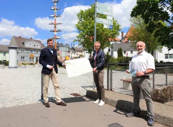 Landrat Dr. Oliver Bär, Alexander Künzl und Jürgen Wälzel (beide Tiefbauamt, zuständig für Radwege) mit einer Radwegekarte des Landkreises