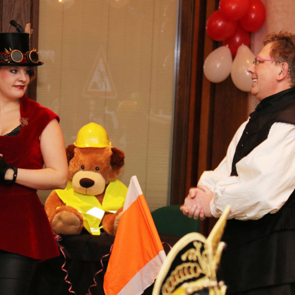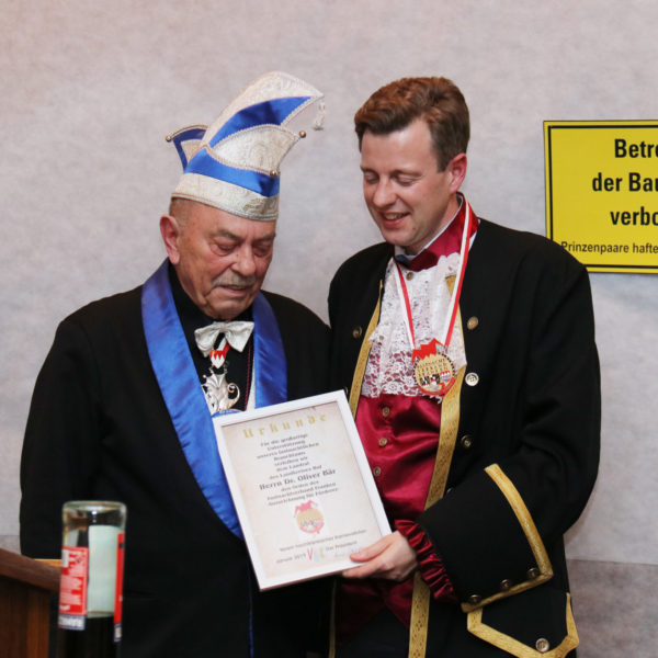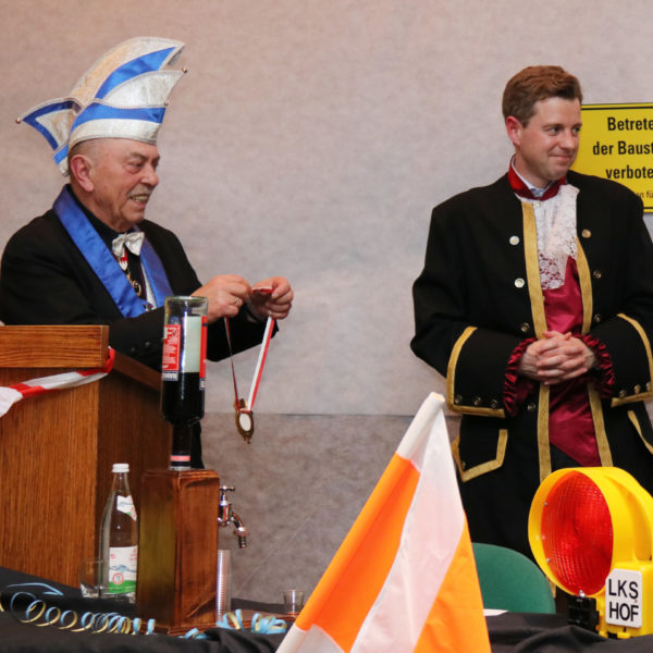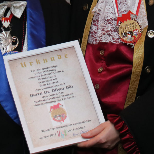 Eingangs wurde der Landrat für sein Engagement für die Karnevalsgesellschaften ausgezeichnet. Erwin Schuberth, 1. Vorsitzender des Vereins Hochfränkischer Karnevalisten, überreichte ihm für die großartige Unterstützung des fastnächtlichen Brauchtums den „Orden des Fastnacht Verbandes Franken - Auszeichnung für Förderer“ und eine Urkunde. Bär würdigte das große ehrenamtliche Engagement der Karnevalsgesellschaften: „Ich weiß, wie viel Arbeit dahintersteckt und wie viel Lebensfreude Sie damit den Menschen vermitteln.“