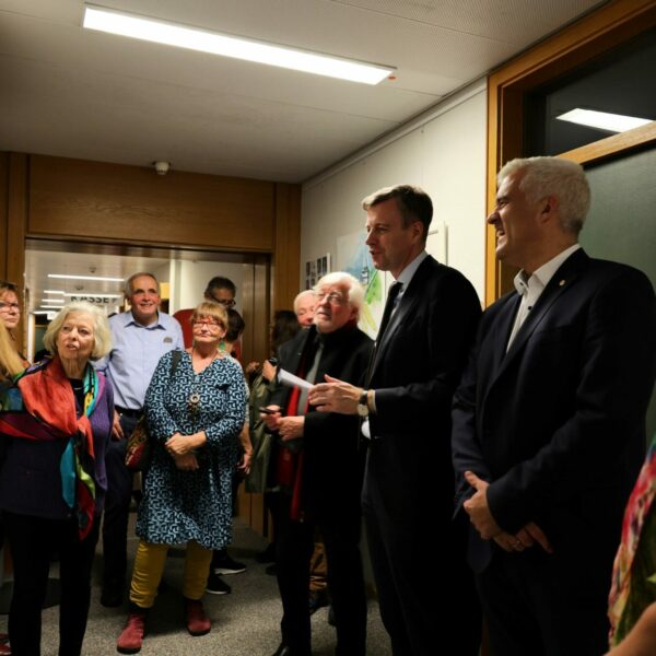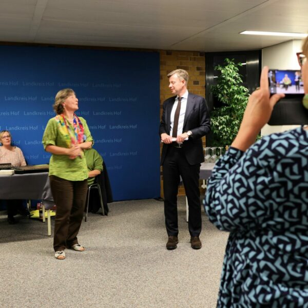 Eine Ausstellung von oberfrankenweiter Bedeutung wurde diese Woche vom Hofer Landrat Dr. Oliver Bär und Ludwigsstadts Erstem Bürgermeister Timo Ehrhardt im Hofer Landratsamt eröffnet. Gemeinsam zeigen hier 18 Künstlerinnen und Künstler aus ganz Oberfranken (und darüber hinaus) unter dem Motto „Unterwegs am fränkischen Rennsteig“ eine Auswahl ihrer Werke, die bei den 28. Oberfränkischen Malertagen im Juni in der oberfränkischen Rennsteig-Region entstanden sind.