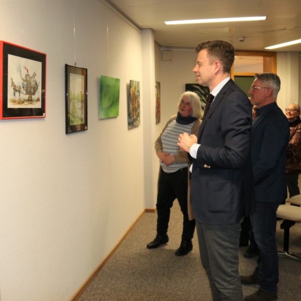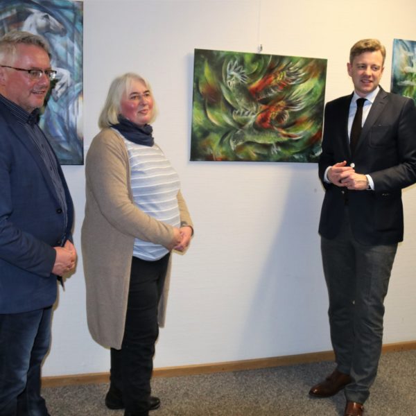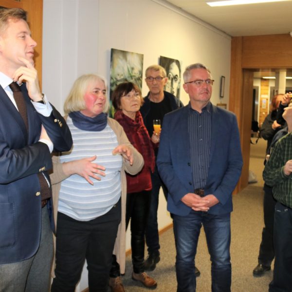 In der Kleinen Galerie des Landratsamtes Hof ist jetzt die Ausstellung der Helmbrechtser Künstlerin Christine Krauß eröffnet worden. Die Autodidaktin stellt insgesamt 34 Werke unterschiedlichster Techniken aus. Darunter Portraitmalereien, Bleistiftzeichnungen und Karikaturen. Christine Krauß sagt selbst von sich, dass sie bereits in der Schule gerne gemalt hat, aber erst vor etwa 10 Jahren ihre Leidenschaft zur Kunst wiederentdeckt hat. Ihre allererste Ausstellung hatte die 58-jährige vor neun Jahren ebenfalls im Landratsamt Hof.