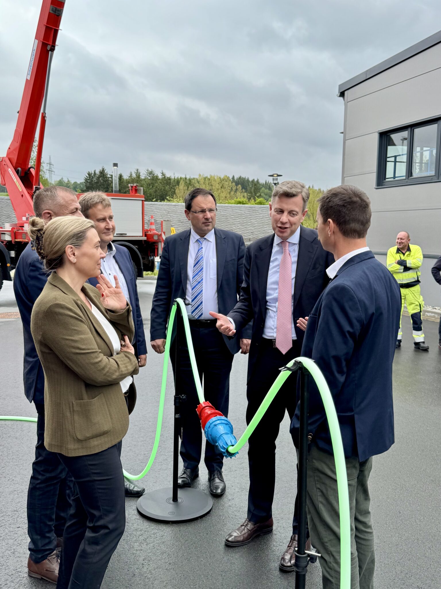 Bild (von links): Markus Seidel (Leiter Kundencenter Naila), Thomas Spang (Leiter Region Franken), Dr. Daniela Groher (Finanzvorständin Bayernwerk AG), Frank Stumpf (Bürgermeister Naila), Staatssekretär Martin Schöffel und Landrat Dr. Oliver Bär.