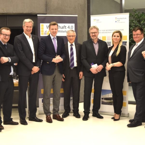 Auch bei der anschließenden Podiumsdiskussion mit Dr. Christian Heinrich Sandler, Vorstand der Sandler AG, dem Präsidenten der Hochschule Hof Prof. Dr. Dr. h.c. Jürgen Lehmann und Dr. Hanns-Peter Ohl, Geschäftsführer der Netzsch-Gruppe, Landrat Dr. Oliver Bär und den Referenten des Abends waren sich alle einig, dass die Region mit der Hochschule Hof und dem iisys als Partner hervorragende Voraussetzungen besitze, um von der Digitalisierung profitieren zu können. „Die Digitalisierung wird die Wahrnehmung und das Ranking von Regionen verändern“, so Landrat Dr. Oliver Bär.