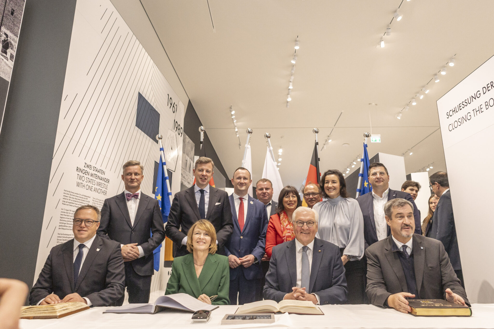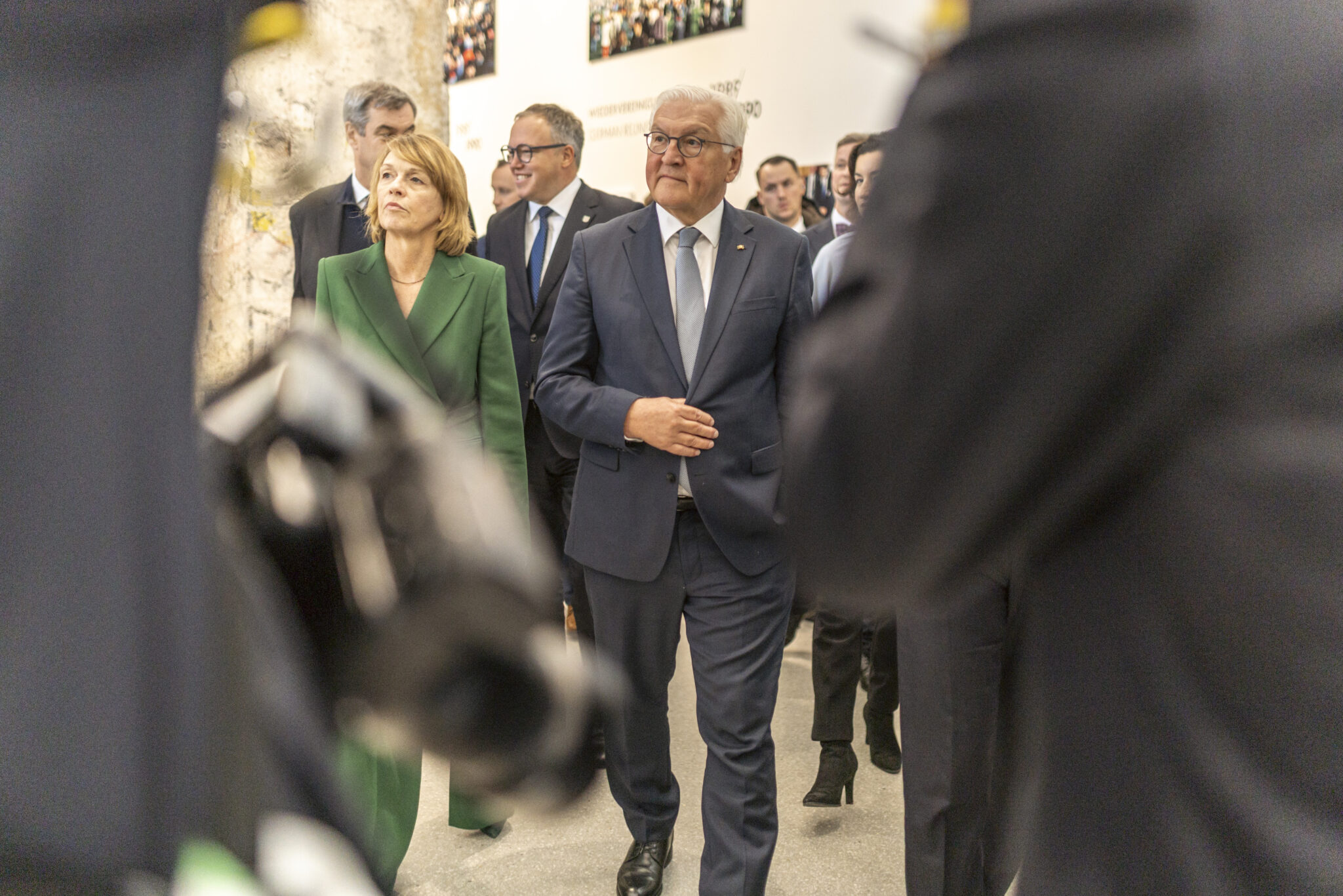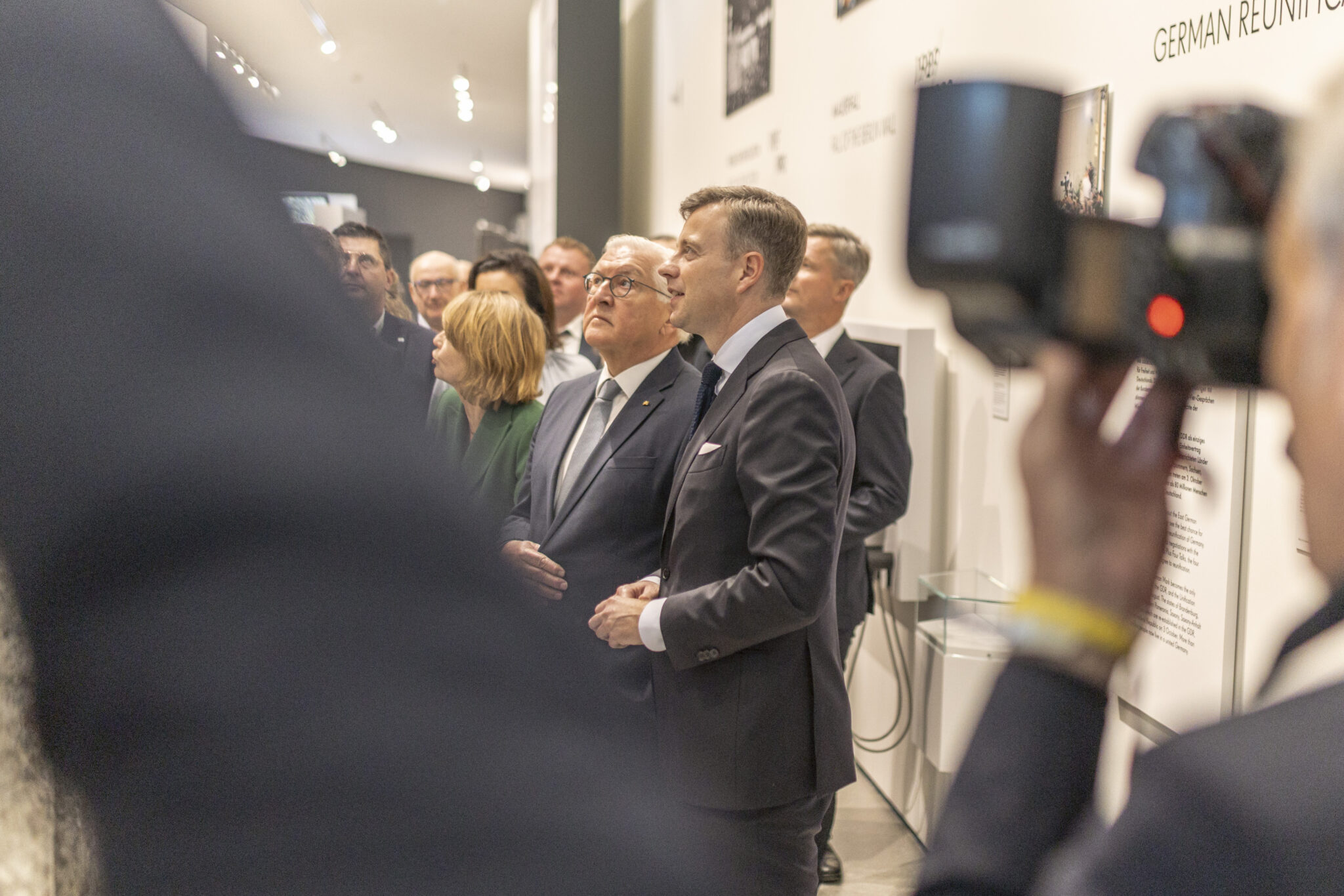 In Anwesenheit von Bundespräsident Dr. Frank-Walter Steinmeier, seiner Frau Elke Büdenbender, der Ministerpräsidenten von Bayern und Thüringen, Dr. Markus Söder und Prof. Dr. Mario Voigt, sowie von Bundesforschungsministerin Dorothee Bär wurde am gestrigen 2. Oktober der Neubau sowie das neugestaltete Freigelände des Deutsch-Deutschen Museums unter großem Medieninteresse feierlich eingeweiht. Nach dem gemeinsamen Rundgang durch die neue Dauerausstellung und Gesprächen mit Zeitzeugen und Schülern auf dem Freigelände an der früheren innerdeutschen Grenze ging es zum feierlichen Festakt mit rund 500 geladenen Gästen. Die offizielle Eröffnung und Inbetriebnahme des neuen Gebäudes für die Öffentlichkeit wird am 9. November im Beisein des Beauftragten der Bundesregierung für Kultur und Medien, Wolfram Weimer, erfolgen.