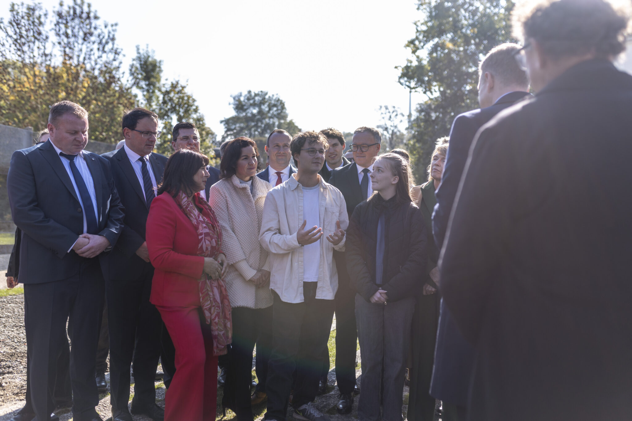 Beim anschließenden Rundgang durch das Dorf und das jüngst neugestaltete Freigelände führten die Spitzen des Museumszweckverbandes, Landrat Dr. Oliver Bär (Hof), Landrat Christian Herrgott (Saale-Orla-Kreis) und Landrat Thomas Hennig (Vogtlandkreis), die Ehrengäste gemeinsam. Dabei vermittelten Gespräche mit Zeitzeugen, Schülern und Lehrern ganz persönliche Einblicke in Zeit der Teilung und der Wiedervereinigung sowie in die Erinnerungsarbeit, die hier heute täglich geleistet wird. So gaben Museumsmitbegründer und Bürgermeister a. D. Arnold Friedrich (Bayern) sowie Martina Gessner (Thüringen) Einblicke in das Leben im ehemals geteilten Dorf. Vom Alltag im vereinten Mödlareuth erzählten Tanja Meyer (Bayern) und Tobias Müller (Thüringen). Als Vertreter der jüngeren Generation, die die deutsche Teilung nicht mehr selbst erlebt hat, berichteten Schülerinnen und Schüler des Johann-Christian-Reinhart-Gymnasiums in Hof, was dieses kleine Berlin als Lernort „direkt vor der Haustür“ für sie bedeutet.