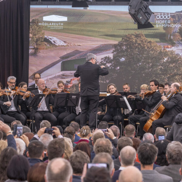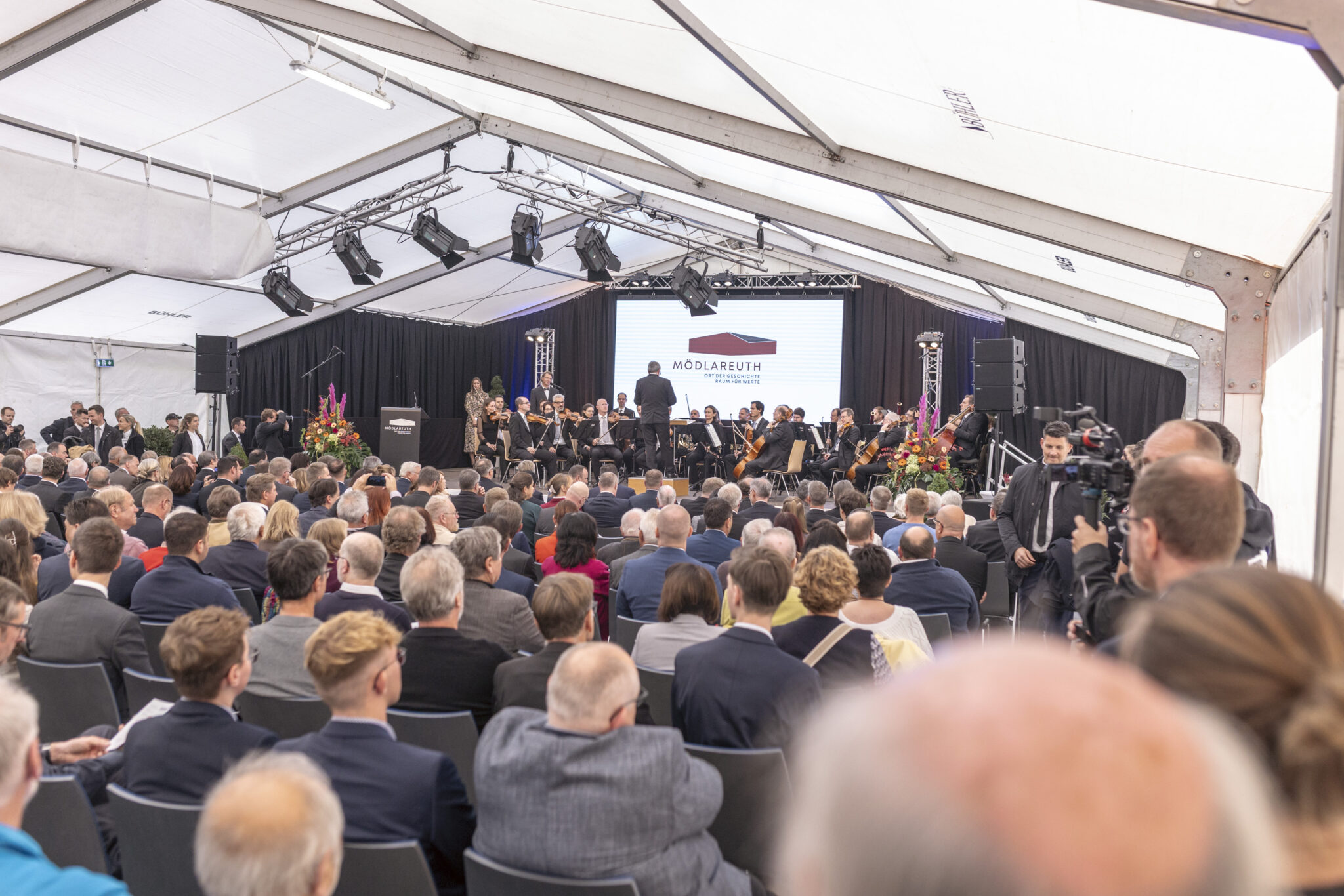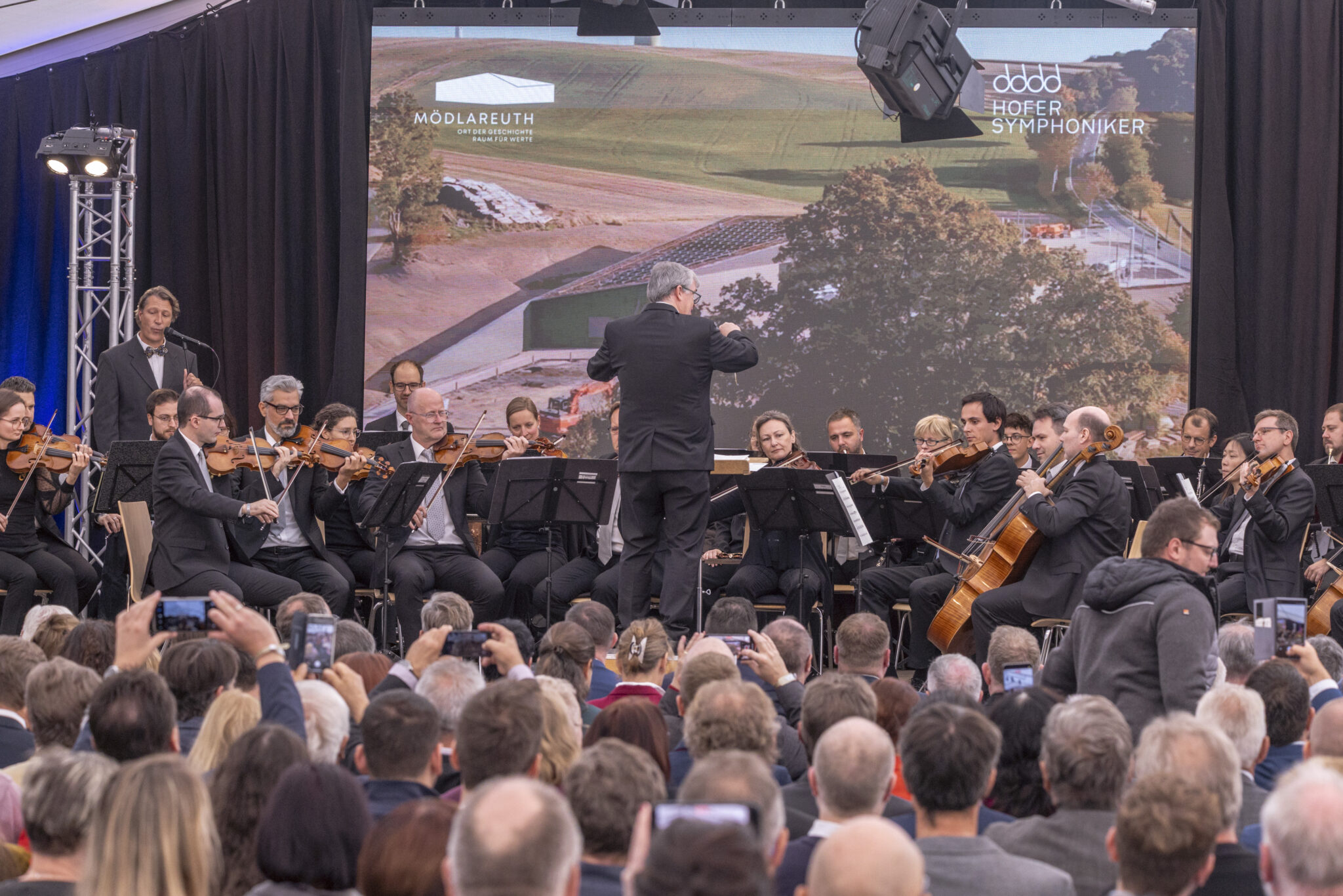 Zum anschließenden feierlichen Festakt wurde der hohe Besuch von rund 500 geladenen Gästen in einem Festzelt auf der Thüringer Seite des Dorfes erwartet. Die musikalische Umrahmung übernahmen die Hofer Symphoniker unter der Leitung von Arn Goerke, die etwa mit einer eigens arrangierten Orchesterversion von „Wind of Change“ die Zuhörer sichtlich berührten.