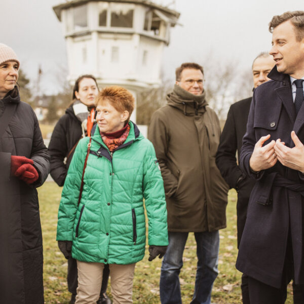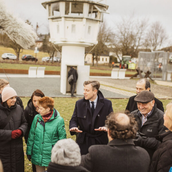 Nach der Begrüßung durch Landrat Dr. Bär besichtigten die Gäste das neugestaltete Außengelände des Museums. Begleitet wurden sie dabei von Vertreterinnen und Vertretern der Politik und des Museums sowie Zeitzeugen, Ehrenamtlichen und Schülern. Neben der original erhaltenen Mauer, die Mödlareuth einst teilte, zeigt das Freigelände weitere original erhaltenen Elemente der früheren DDR-Sperranlagen.