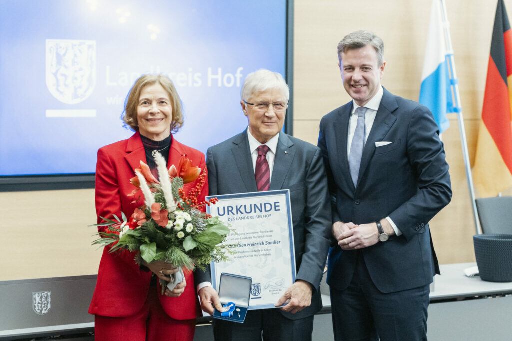 Im Rahmen der letzten Kreistagssitzung dieses Jahres hat Landrat Dr. Oliver Bär den Schwarzenbacher Unternehmer Dr. Christian Heinrich Sandler mit der Verdienstmedaille in Silber des Landkreises Hof geehrt. Die Medaille ist die höchste Auszeichnung, die der Landkreis vergibt. Seit ihrer Einführung im Jahr 1977 würdigt sie Persönlichkeiten, die sich in außergewöhnlicher Weise um die Region verdient gemacht haben. Landrat Dr. Oliver Bär betonte die herausragenden Leistungen und das persönliche Wirken des Geehrten: „Christian Heinrich Sandler ist eine allseits geschätzte Persönlichkeit, deren Engagement für unsere Region beispielgebend ist. Mit großer Verantwortung, Weitsicht und menschlicher Zuwendung hat er die wirtschaftliche Entwicklung im Hofer Land und weit darüber hinaus geprägt. Christian Heinrich Sandler ist zudem als sehr menschlich bekannt – ein Christ, der sich stets auch um die Familien seiner Mitarbeiter gekümmert hat. Gemeinsam mit seiner Frau hat er oft private Anliegen besprochen […]