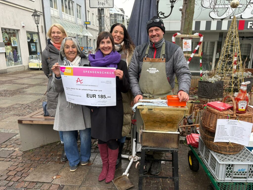 Rund 150 Besucherinnen und Besucher folgten kürzlich der Einladung zum Tag der offenen Tür der Leitstelle Pflege Hofer Land, der im Rahmen der Bayerischen Demenzwoche unter dem Motto „Demenz hat viele Feinde: Bewegung, Ernährung und Vorsorge“ stand. Im Mittelpunkt des Aktionstages standen niederschwellige Angebote zur Demenzprävention sowie vielfältige Informationsmöglichkeiten für Interessierte. Großen Anklang fand die kulinarische Spendenaktion: Der Hofer Wärschlamo Marcus Traub, der die Leitstelle Pflege Hofer Land seit Beginn als verlässlicher Partner begleitet, bot seine beliebten Hofer Wienerla auf Spendenbasis an. Dank der großen Unterstützung der Besucher kamen 185 Euro zusammen, die vollständig an die Alzheimer Gesellschaft Regionalgruppe Hof/Wunsiedel e.V. gespendet wurden.