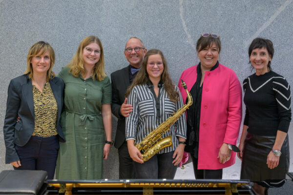 (v.l.): Sandra Wolf (Demografie -Kompetenzzentrum Oberfranken, Oberfranken Offensiv), Lisa-Maria Moritz (Seniorenkoordination Landkreis Hof), Matthias Dinkel (Klavier), Mona Dinkel (Saxofon), Sabine Distler (Curatorium Altern gestalten), Ute Hopperdietzel (Fachstelle für Demenz und Pflege Oberfranken)