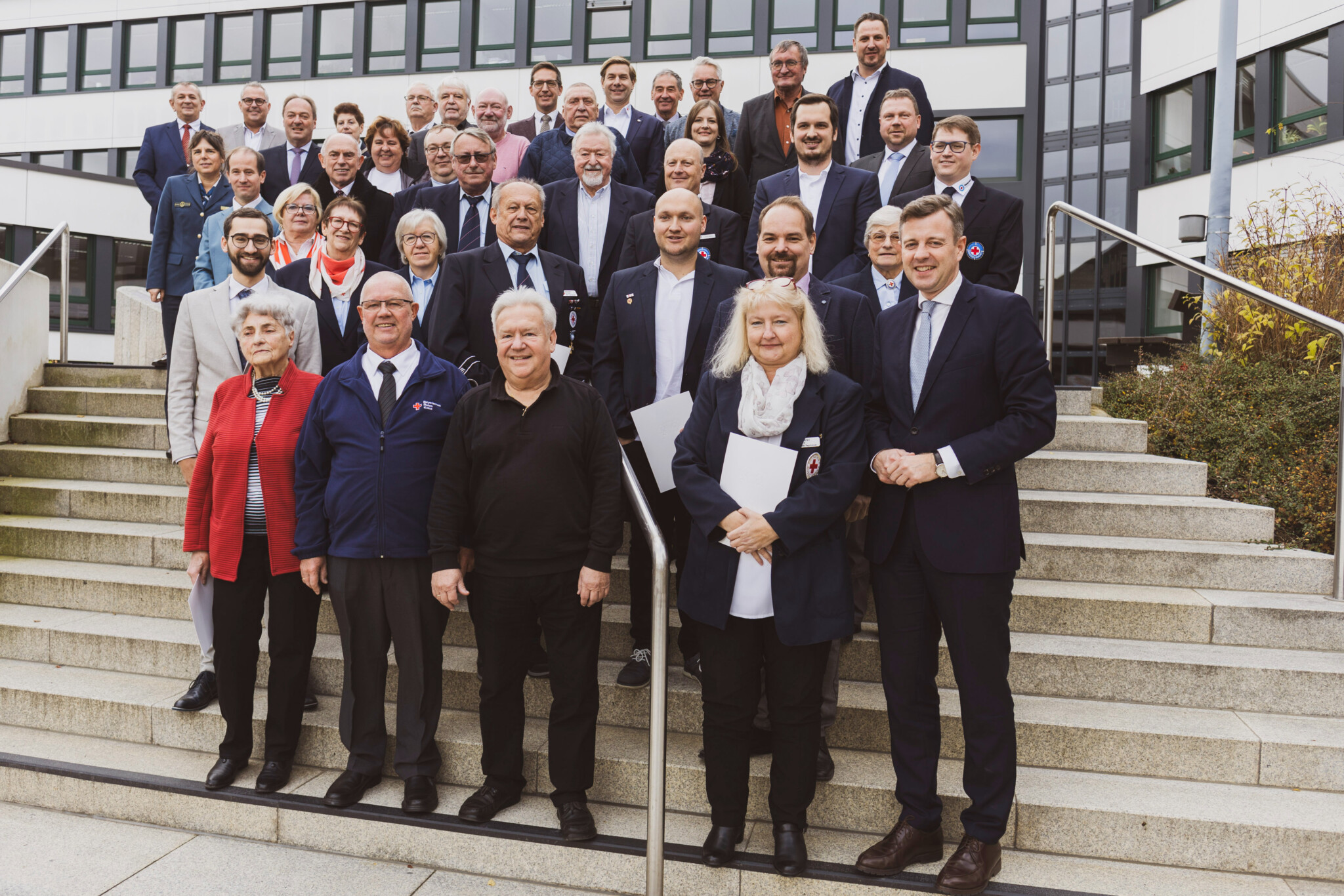 Insgesamt 25 Ehrenamtliche des Bayerischen Roten Kreuzes (BRK) und des Technischen Hilfswerks (THW) wurden jetzt von Landrat Dr. Oliver Bär für ihren jahrzehntelangen Dienst ausgezeichnet. Im Sitzungssaal des Landratsamtes überreichte er, auch im Namen des Staatsministers Joachim Herrmann, die entsprechenden Urkunden und Ehrenabzeichen und dankte den ehrenamtlichen Mitarbeitern und Mitarbeiterinnen aus dem Landkreis für ihr vorbildliches Engagement. „Sie werden heute geehrt, weil Sie gebraucht werden. Sie sind Familie und leben das auch. Wir bedanken uns. Seien Sie stolz auf sich - wir sind es auf jeden Fall“, so Landrat Dr. Bär.