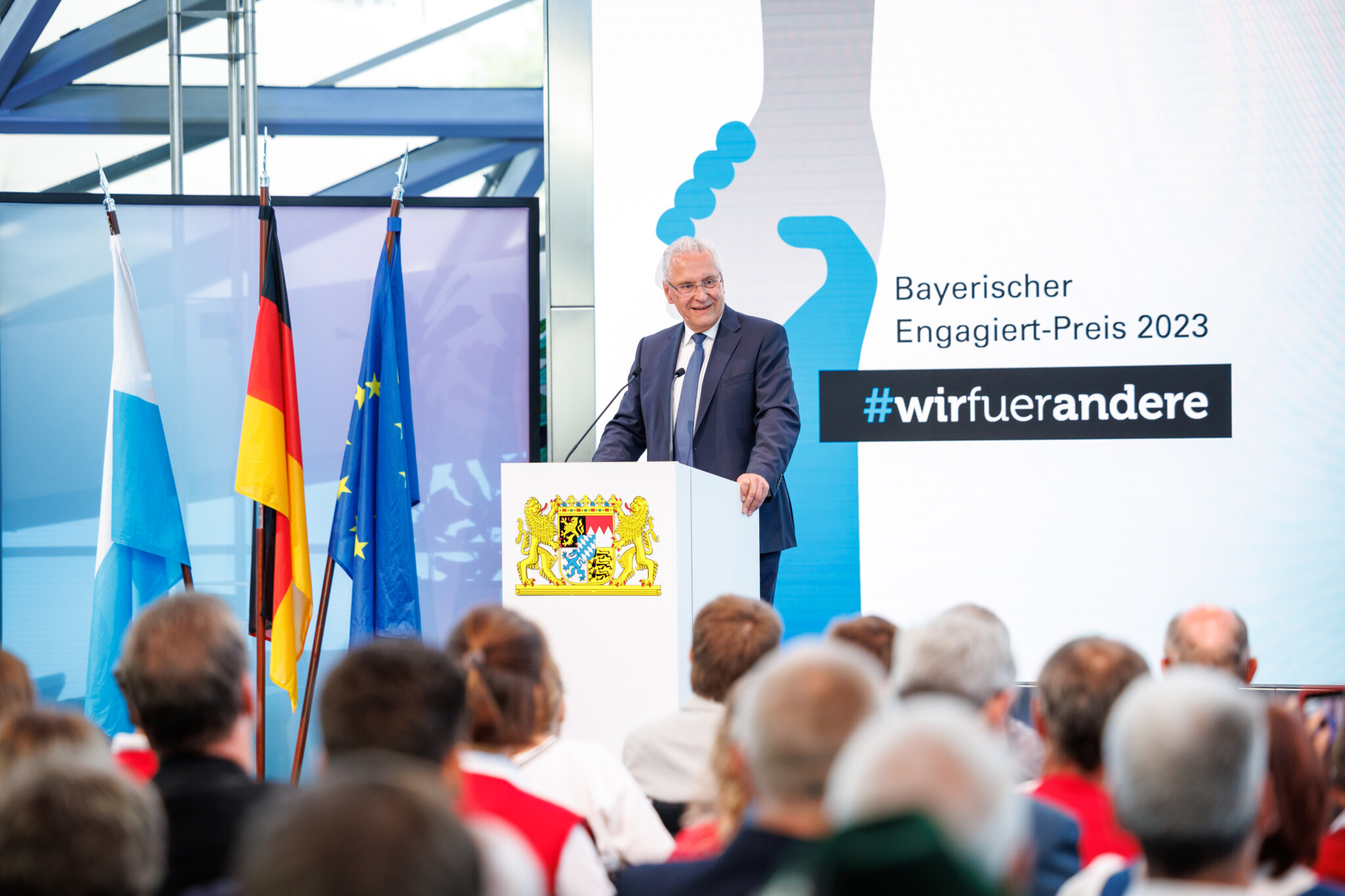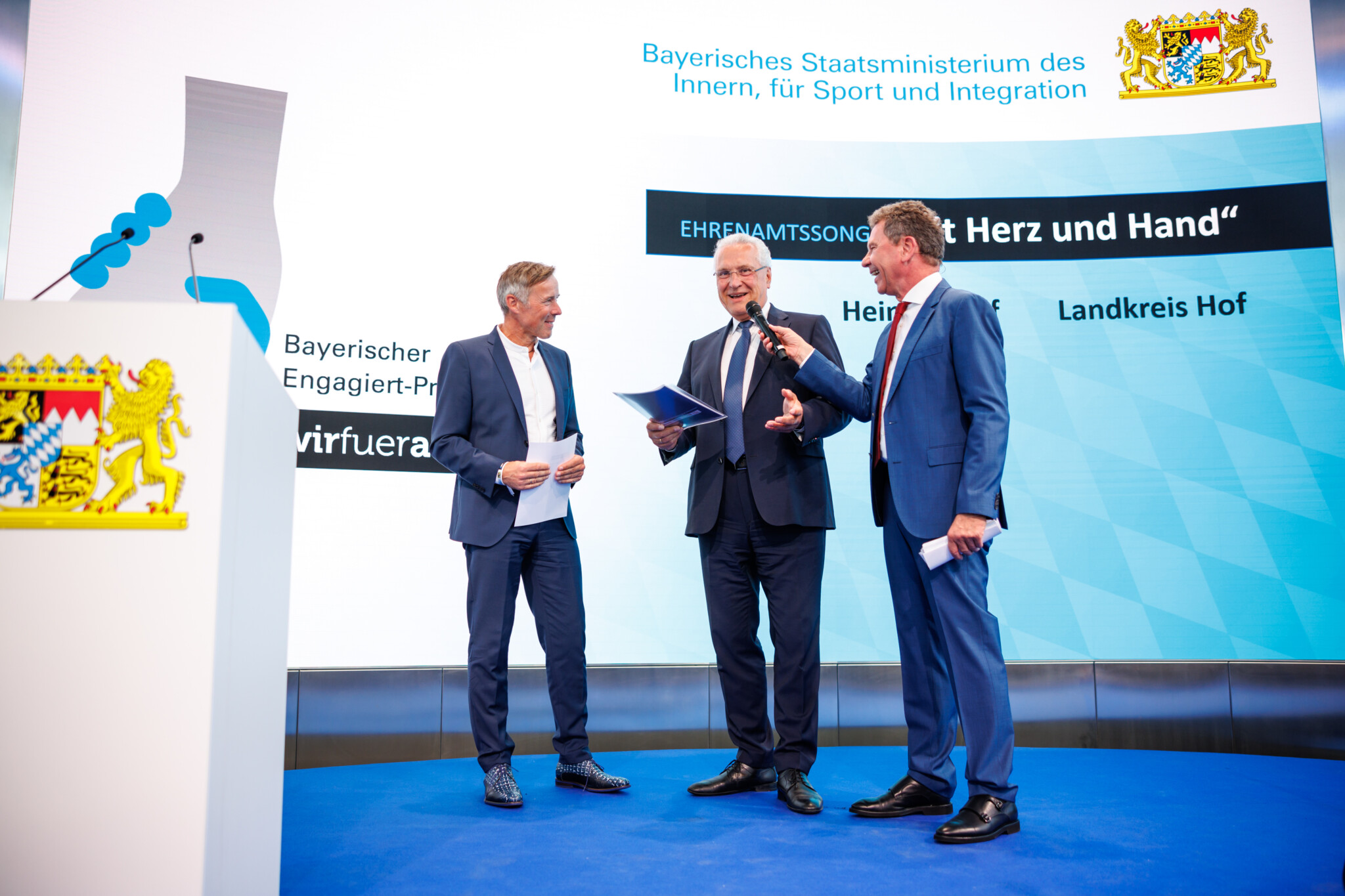 Dafür reiste das Team des Koordinierungszentrums Bürgerschaftliches Engagement (KoBE) des Landkreises Hof auf persönliche Einladung des Bayerischen Innenministers zur Verleihung des „Bayerischen Engagiert-Preis 2023“ nach München. Bei der Festveranstaltung in der BMW Welt wurden herausragende Leistungen im Ehrenamt, für die Sicherheit der Menschen in Bayern, im Sport und in der Integration gewürdigt. In diesem Rahmen wurde auch das Video zum Ehrenamtssong gezeigt, und stellvertretend für alle Beteiligten nahm Heiner Wolf (KoBE) die Urkunde aus den Händen von Innenminister Joachim Herrmann entgegen.