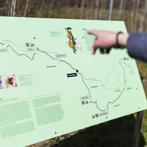 Die Anrainergemeinden stellten Überlegungen an, wie man die neue Radwegeverbindung touristisch in Wert setzen kann. Hierzu wurden zunächst im Zuge eines EU-Kleinprojektefonds des INTERREG-Programms Bayern-Tschechien 2021-2027, welches von der EUREGIO EGRENSIS Arbeitsgemeinschaft Bayern e.V. mit einer großzügigen Förderung von 80% bewilligt wurde, Layouts für neun Infotafeln vom Büro Pöhlmann in Zusammenarbeit mit den jeweiligen Kommunen erstellt. In diesen neun thematischen Infotafeln wurde die reichhaltige Geschichte der gemeinsamen Grenzregion aufgearbeitet. Im April wurden sie dann entlang der Perlenroute durch die jeweiligen Bauhöfe errichtet. Konkret befinden sich die Stadtorte in Oberkotzau (Summa-Park), Wurlitz, Rehau, Eulenhammer, Perlenhaus, Schönwald, Plößberg, Wildenau und Asch.