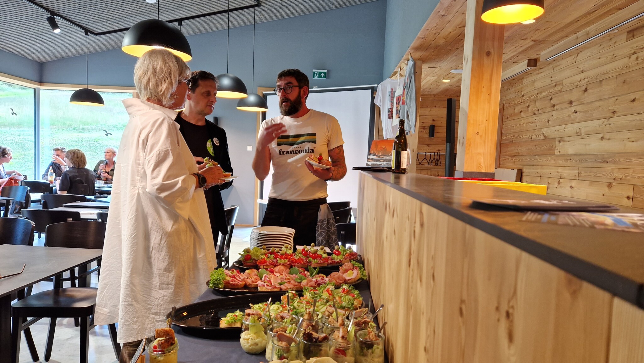 Als ein Projekt, das bereits im Entstehen ist, stellte etwa Sabine Gollner von der KÜKO – Künstlerkolonie Fichtelgebirge nach ersten positiven Erfahrungen im Fichtelgebirge nun ein neues Konzept in Zusammenarbeit mit der Stadt Hof vor, das innerstädtische Leerstände kreativ zu nutzen und beleben will. Alexander Popp, Wirtschaftsförderer des Landkreises Wunsiedel, und Finn Regenhold, im Landkreis zuständig für die Kreativwirtschaft, kündigten zudem ein Barcamp für Kreative an, das sich in Planung befindet. Als Beispiel für ein kreatives, neues Geschäftsmodell war Gründer Jan Schultheis eingeladen, um sein sozialwirtschaftliches Start-up „Asante Sanaa“ vom Bayreuther „StartUp Point“ vorzustellen. Ziel des Unternehmens ist es, Künstlerinnen und Künstler aus Ostafrika zu unterstützen, indem es ihnen einen Marktplatz für ihre Kunst bietet. Anschließend stand der Austausch untereinander im Vordergrund, was von den Teilnehmern rege genutzt wurde, die sich an diesem Sommerabend zudem auch vom modernen, entspannten Ambiente des neuen Kornberghauses begeistert zeigten.