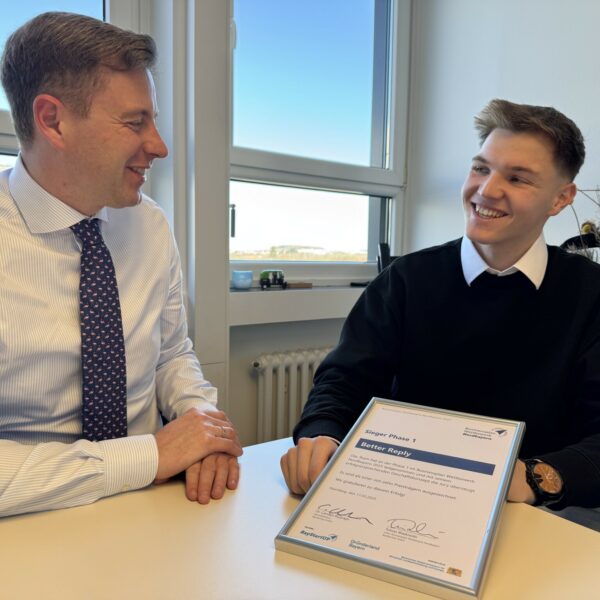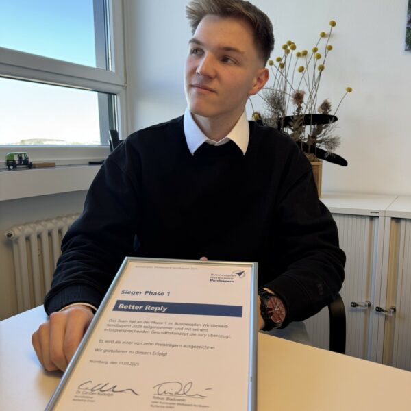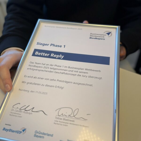 Der 19-jährige steht gerade kurz vor den Abiprüfungen und hat quasi nebenbei sein eigenes Unternehmen gegründet. Seine Idee: Google Bewertungen mit Hilfe von künstlicher Intelligenz blitzschnell, präzise und im Stil des eigenen Unternehmens beantworten. Nach einer einjährigen Testphase ist er vor drei Wochen mit seinem Start-up „Better Reply“ live gegangen und hat damit gleich ins Schwarze getroffen. Beim Businessplan-Wettbewerb von BayStartup wurde er jetzt mit dem ersten Platz für seine Idee ausgezeichnet.