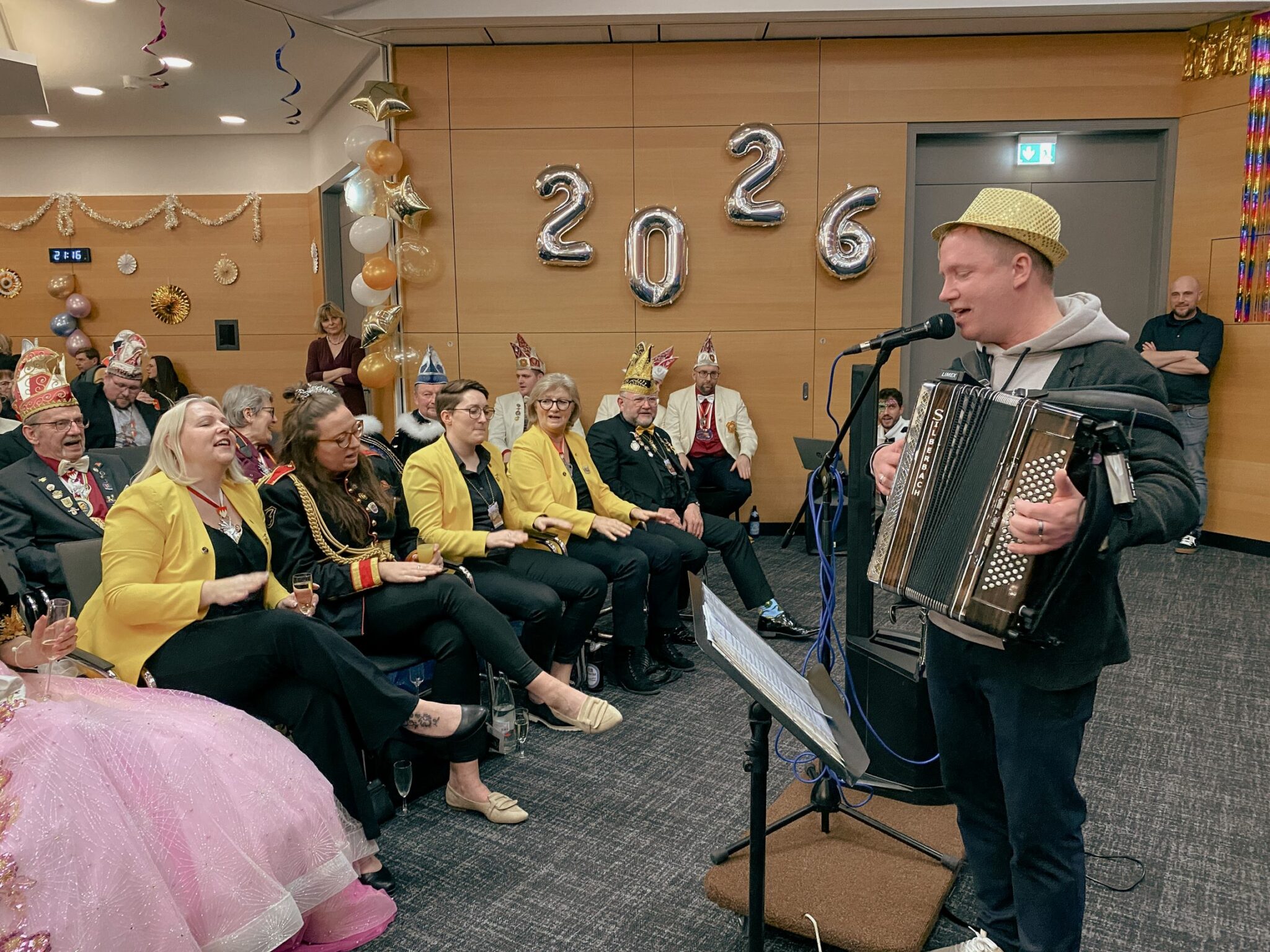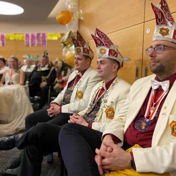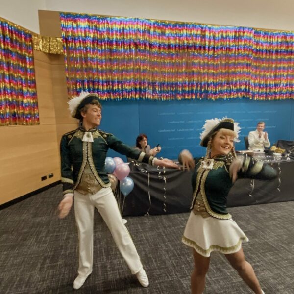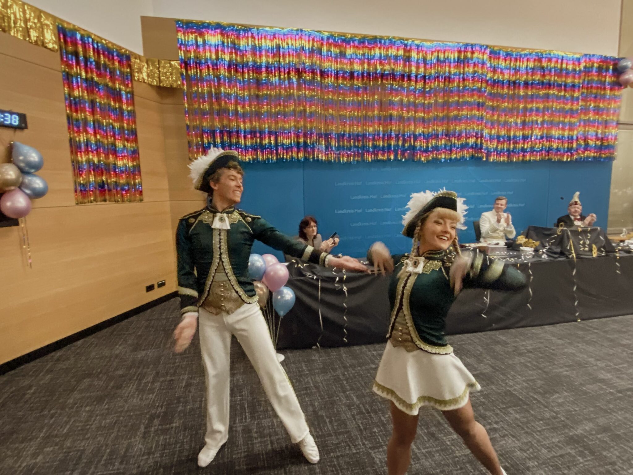Einen kleinen Einblick in die Vielfalt und Qualität der Akteure der Karnevalsgesellschaften gab es dann auch im Sitzungssaal des Landratsamtes. Das Helmbrechtser Ü15-Tanzpaar Jenny Schmidt und Tim Fichtner, drei Mädchen der Prinzessinnengarde der TSG Münchberg und das Männerballett „Die Fastnachtshirsche“ aus Rehau verwandelten den Teppich in ein Tanzparkett. Die beiden Helmbrechtser Nachwuchs-Narren Letizia Zeh und Henry Siemon begeisterten mit ihrer Kinderbütt, Claudia und Kalli aus Lippertsgrün suchten in Italien Sangria-Eimer und Maria, Sabine und Kerstin alias Tri-Ri-Tere von der Narhalla Hof alterten während ihres Auftritts rückwärts. Die „Hofer Schlawienerla“ traten mit Frank Wilutzki als Solo-Schlawiener in verkleinerter Besetzung auf und vertonten Geschichten rund ums Hofer Land. Musikalisch begleitete die Fidele Hinterachse den Abend.