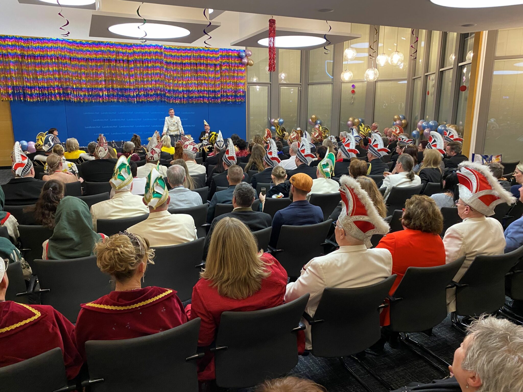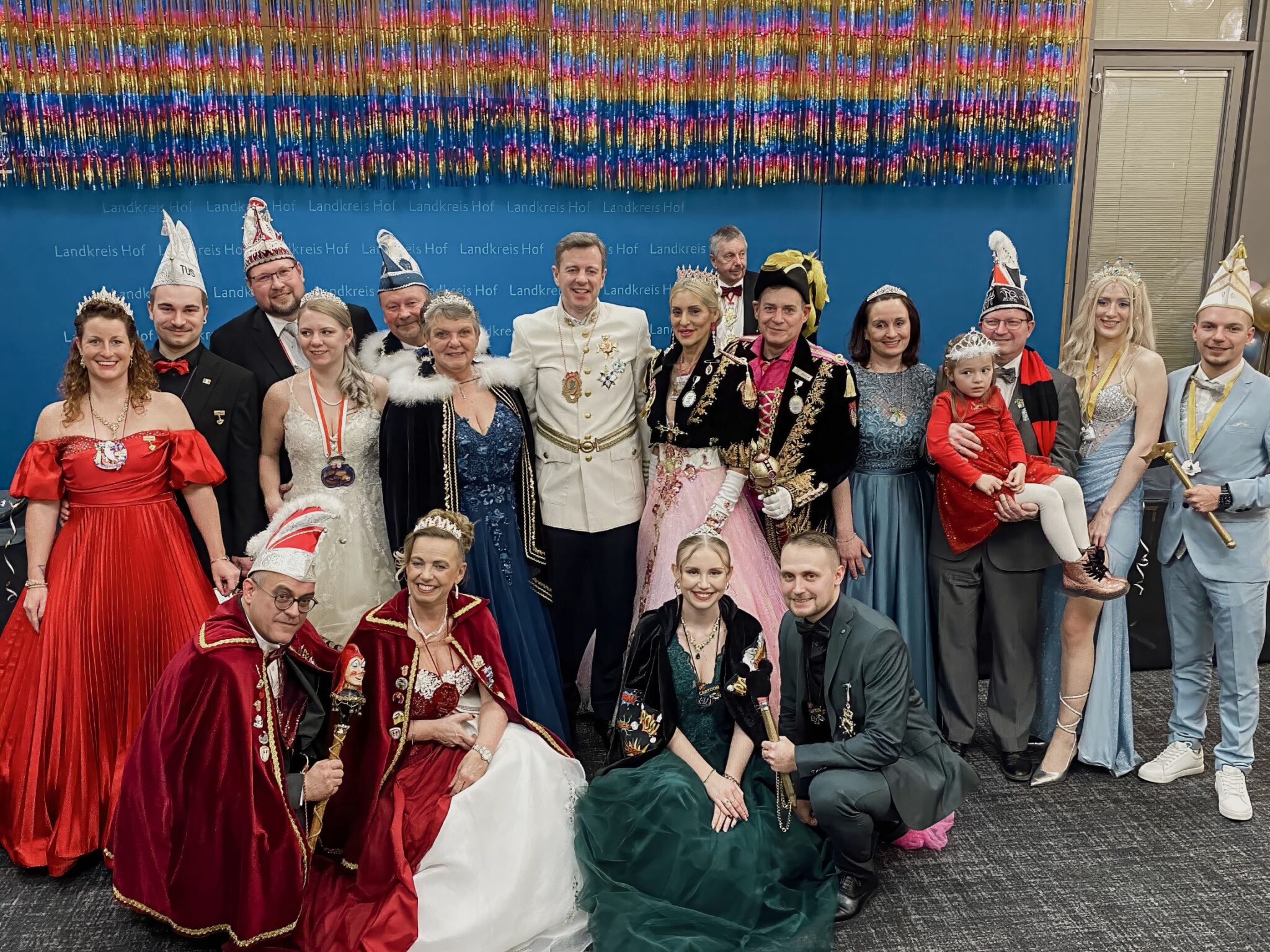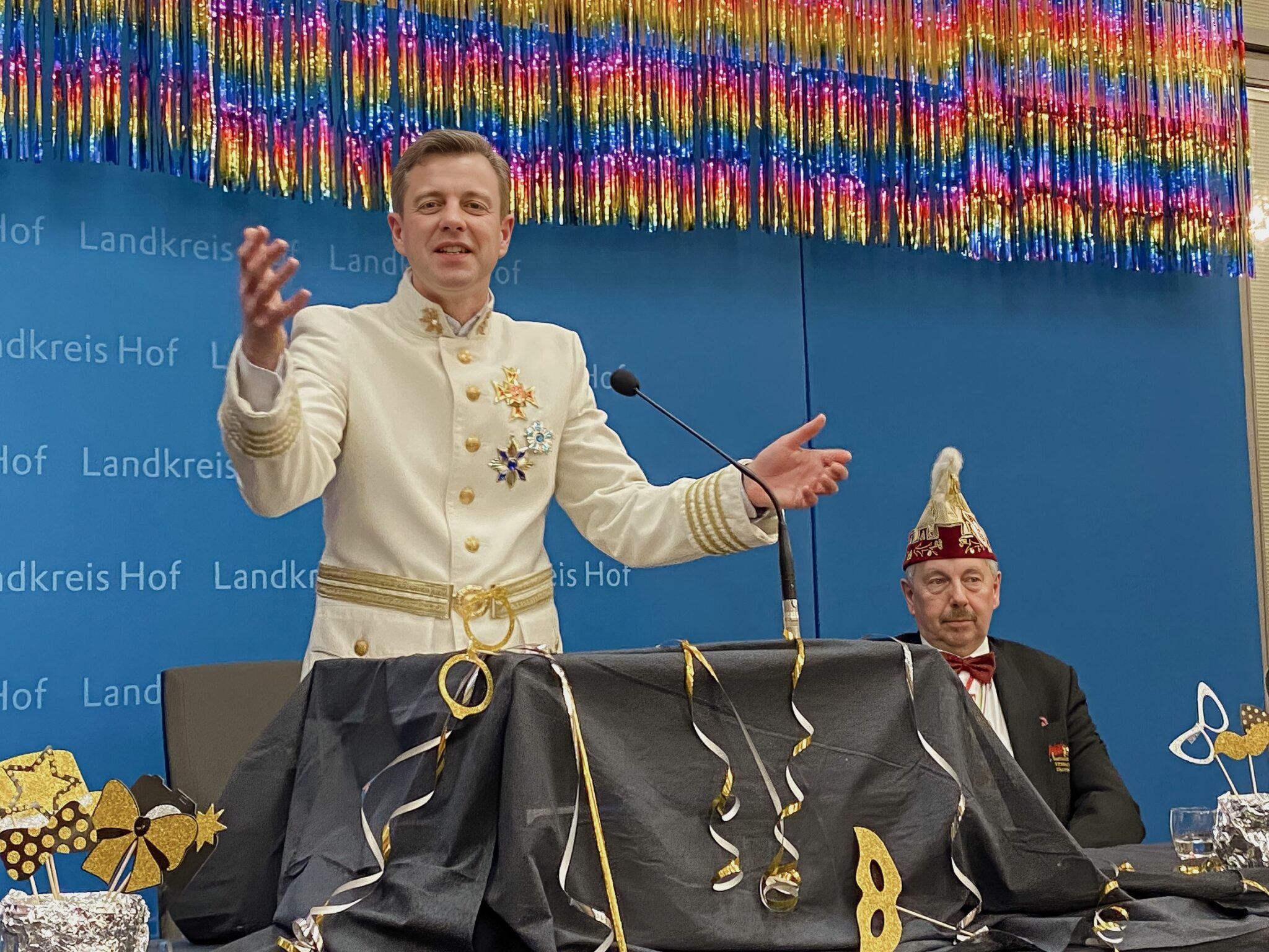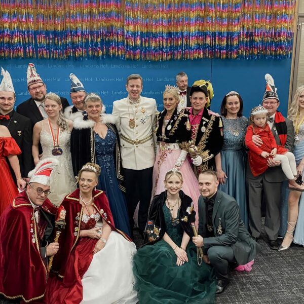 Der Fasching geht seinem Höhepunkt entgegen und traditionell wird dies auch mit einem großen Empfang für die Faschingsgesellschaften des Hofer Landes im Landratsamt gefeiert. Landrat Dr. Oliver Bär hieß etwa 140 Gäste von elf Vereinen mit ihren Prinzenpaaren, den Bezirkspräsidenten des Fastnachtsverbandes Franken, Norbert Greger, die Faschingsgesellschaft Rot-Weiß-Schirnding, den 1. Bürgermeister der Stadt Hohenberg an der Eger, Jürgen Hoffmann, sowie Dieter Gelbrich, der die Brauchtumsmasken für die Rehauer schnitzt, willkommen.