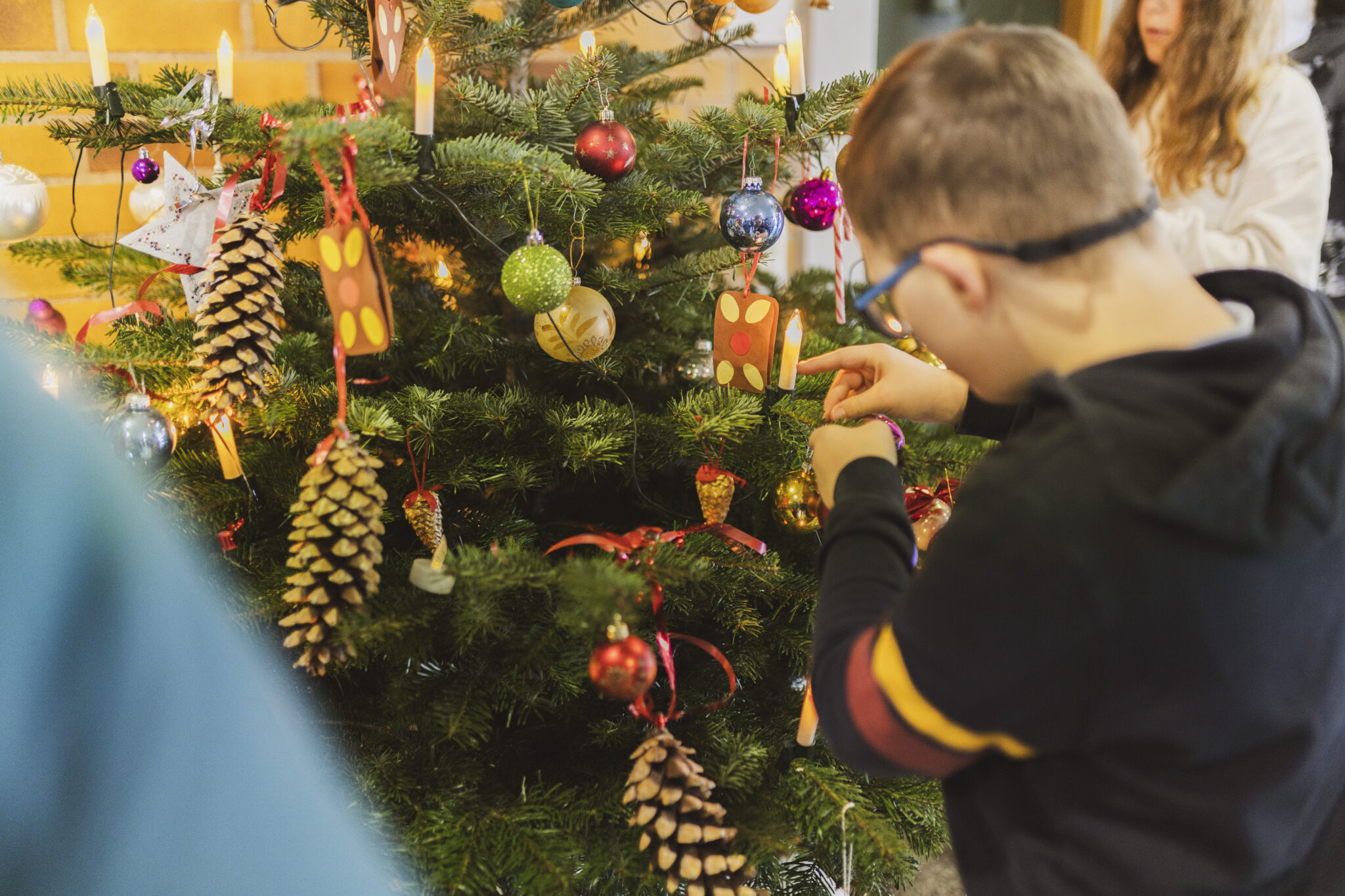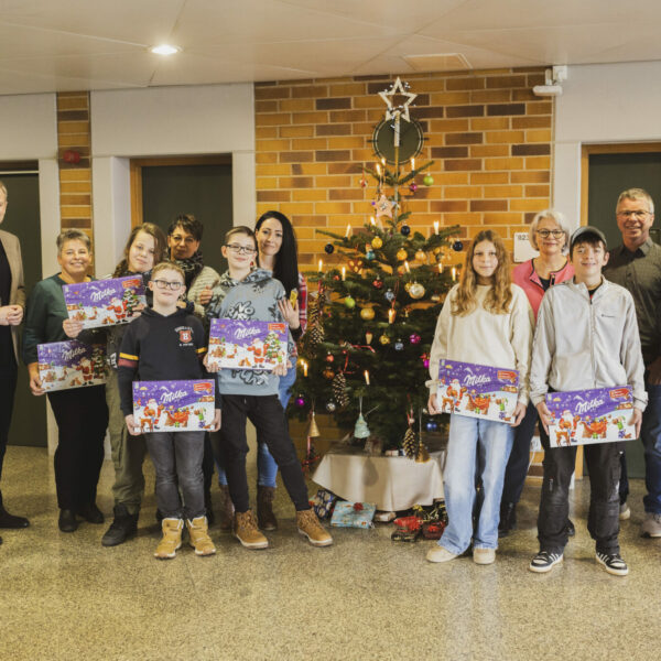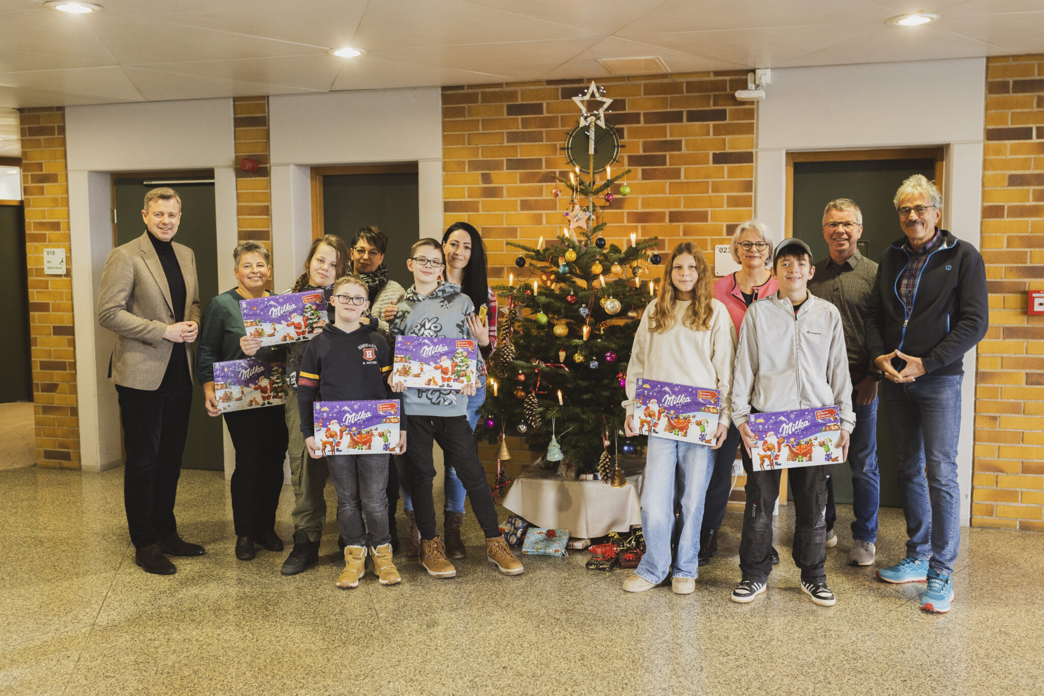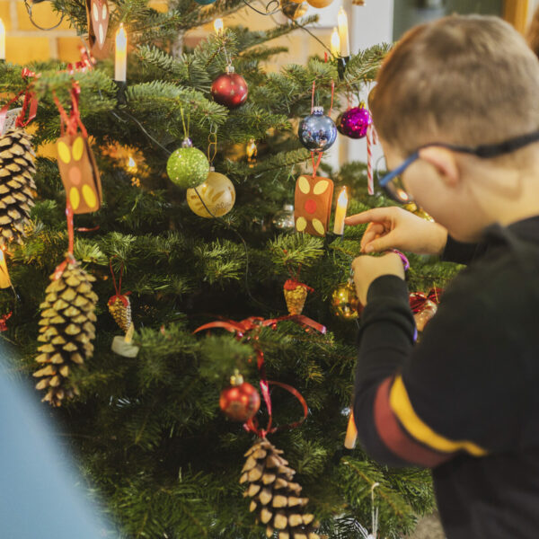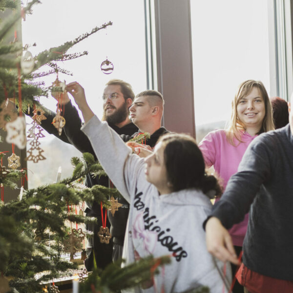 Im Eingangsbereich brachten Silas, Stefani, Marco, Ludwig und Dean zusammen mit Schulassistentin Melanie Kührt, Tanja Saglam und Lehrerin Bettina Männel die handgemachte Weihnachtsdekoration an. Der 1. Vorsitzende der Lebenshilfe, Bernhard Wölfl, sowie Schulleiter Jörg Herzig zeigten sich dankbar für den Einsatz der Schülerinnen und Schüler, die auch in diesem Jahr den Baum wieder so schön gestaltet haben.