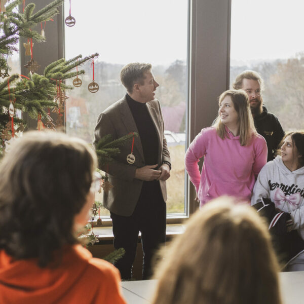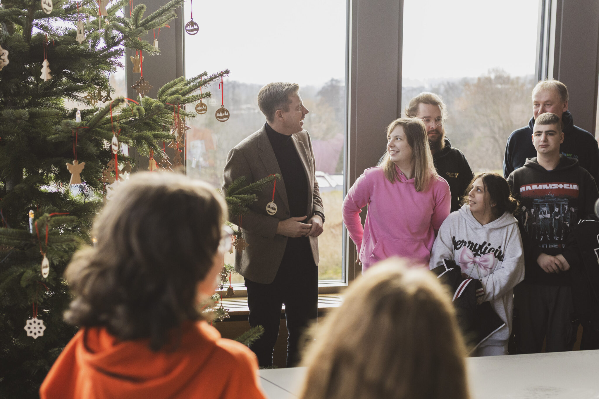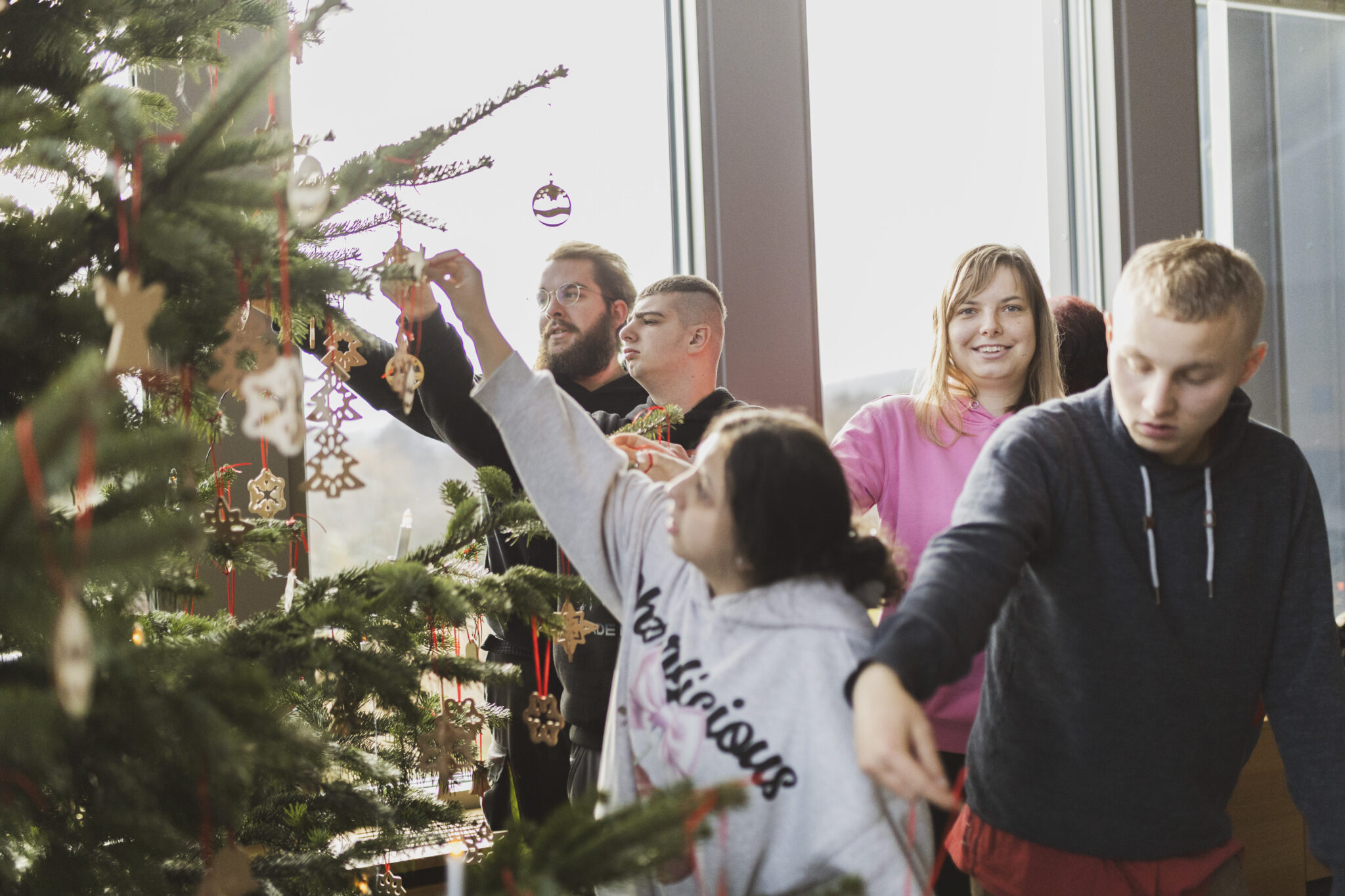 Im Sitzungssaal gestalteten Jutta, Lara, Daniela, Maurice, André und Fynn von den Hochfränkischen Werkstätten den Baum mit liebevoll gefertigten Holzarbeiten. Gruppenleiter Volker Knörnschild freute sich, die selbst produzierte Deko im Landratsamt zeigen zu können und damit eine schöne Weihnachtsatmosphäre zu schaffen.