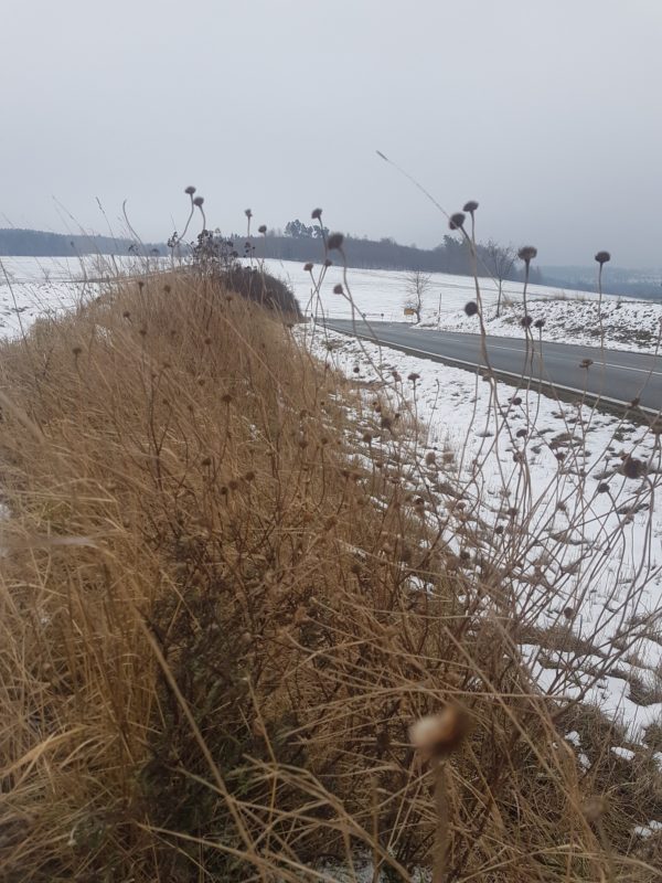 Foto: Alte Pflanzenstängel als natürliche Insekten-Überwinterungshotels: Hier beispielhaft ein ungemähter Streifen an der HO6 von Döhlau Richtung Woja (Foto: Isabel Kaske, LPV Hof)