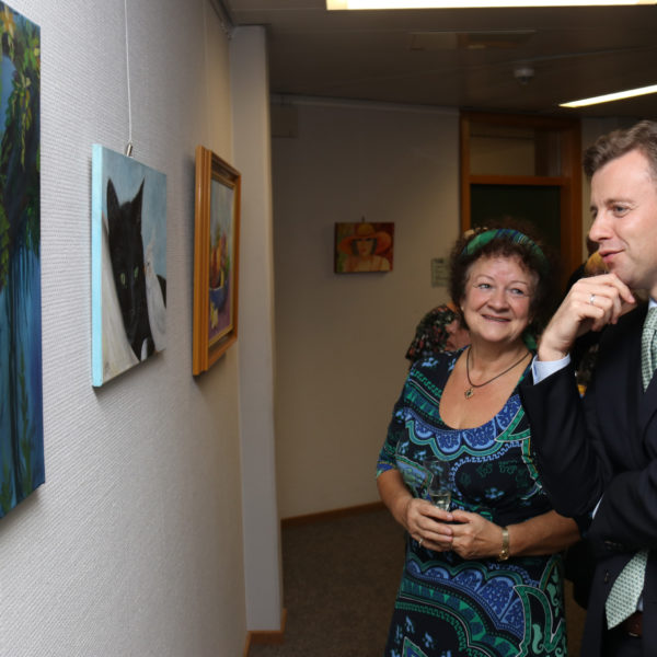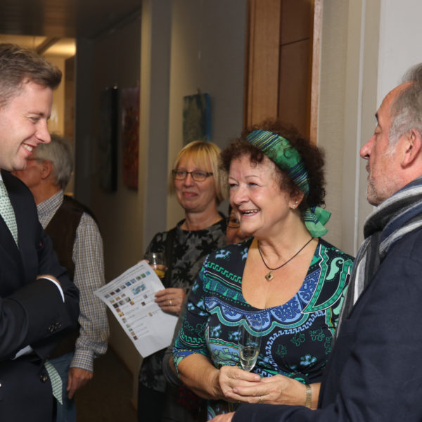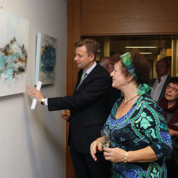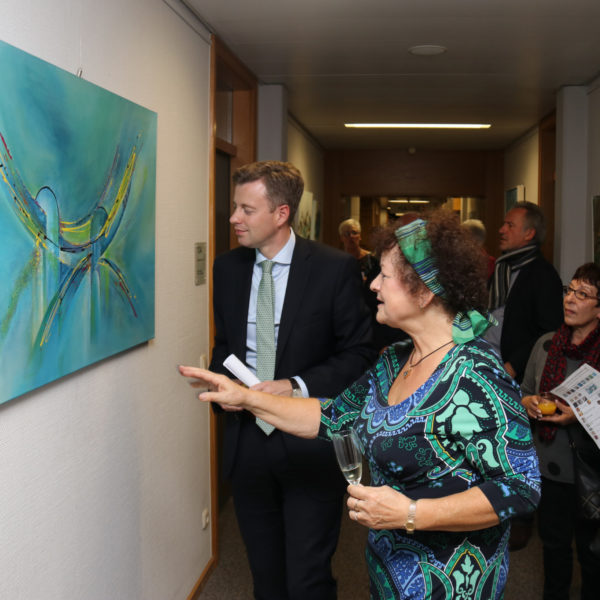 Eine neue Ausstellung schmückt das Landratsamt Hof. Juliane Gotthof zeigt Collagen in Acryl und Öl, gemalt „oft intuitiv, aber mit viel Liebe und Leidenschaft“, so die Künstlerin. Landrat Dr. Oliver Bär freute sich bei der Vernissage über die positive Ausstrahlung, die die Bilder vermitteln und damit auch das Wesen von Juliane Gotthof wiederspiegeln.