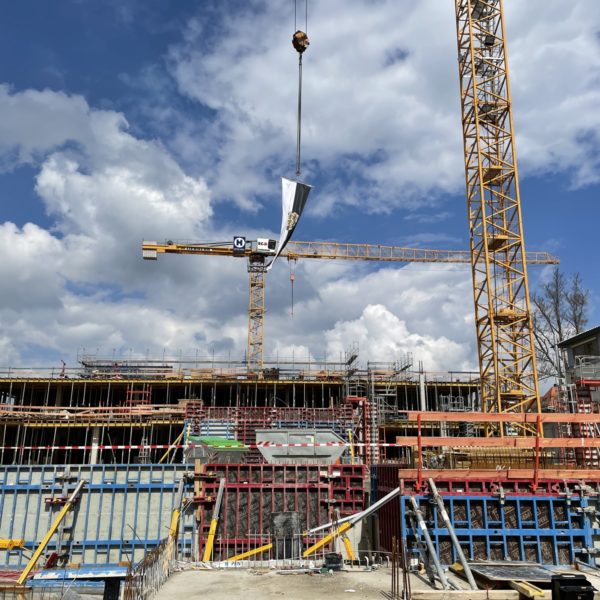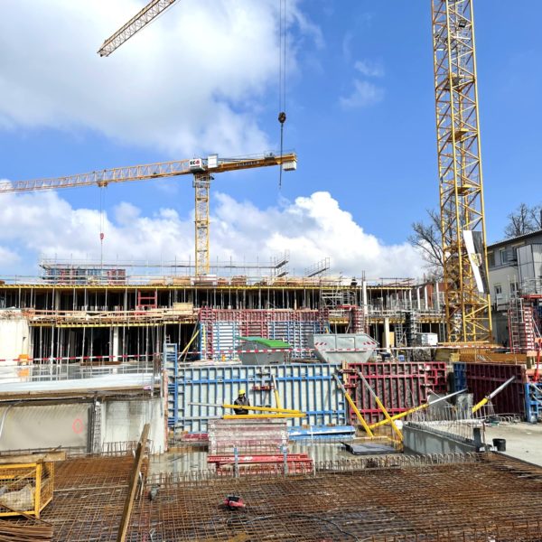 Die Erweiterung der Klinik am Standort Münchberg begann vor zwei Jahren mit dem Abriss der ehemaligen Parkschule sowie der Schwesternschule. Seit vergangenem Jahr laufen nun die Rohbauarbeiten. Damit befindet sich der Bau bislang sowohl im Zeit- als auch im finanziellen Plan. Aktuell laufen parallel die Bauabschnitte eins und zwei. So entsteht ein neues Funktionsgebäude mit Untersuchungs- und Behandlungsbereichen (u.a. Zentrale Aufnahme, Notaufnahme, Ambulanzen, MVZ, Orthopädische Praxis, Radiologie, OP-Bereich). Im zweiten Bauabschnitt wird ein viergeschossiges Gebäude mit Arzt-, Bereitschafts- und Verwaltungsräumen sowie einer Cafeteria mit Kiosk errichtet. Dazu sollen auch Einheiten z.B. für eine Apotheke oder eine externe Praxis entstehen. In einem geplanten dritten Schritt sollen dann zwei Bettenhäuser gebaut werden. Bis diese umgesetzt werden, erfolgt die Anbindung des Neubaus an das bestehende Bettenhaus durch zwei Verbindungsgänge.