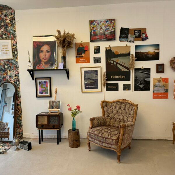 Maureen Heimann (Fotokünstlerin) und Saskia Tröger (Art Director) zeigten Werke zum Thema „Vergänglichkeit“ und „Heimatliebe“. Dabei gab es Plätze zum Verweilen und Innehalten und Raum, um sich mit den Themen Vergänglichkeit und Heimkommen zu beschäftigen. Die liebevoll gestaltete Wohnzimmeratmosphäre bot Gelegenheit, um mit den beiden Künstlerinnen ins Gespräch zu kommen und um neugierig in den werdenden Laden durch ein kleines Fenster einen Blick zu werfen.