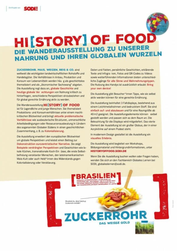 Die Wanderausstellung „HISTORY OF FOOD“ bietet diesen Kontext. Sie ist für junge Menschen konzipiert und vom 27.06.-17.07.2022 in der Außenstelle Münchberg des Beruflichen Schulzentrums zu sehen.