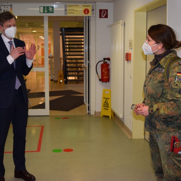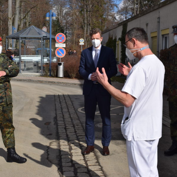 Bei ihrem Termin in der Klinik informierten sich die beiden Generäle über die Einsatzbereiche und Aufgabengebiete der Soldatinnen und Soldaten in der Klinik. Diese sind im administrativen Bereich beispielsweise bei der Organisation von Testungen und Impfungen, am Haupteingang bei der Lenkung der Patienten sowie auf den Stationen und in der Zentralen Notaufnahme unterstützend tätig. Sie wurden aufgrund der angespannten Personalsituation nach einem Corona-Ausbruch vor etwa vier Wochen in der Klinik Münchberg zur Unterstützung angefordert. Der Ausbruch ist inzwischen beendet und der Klinikbetrieb läuft wieder normal.