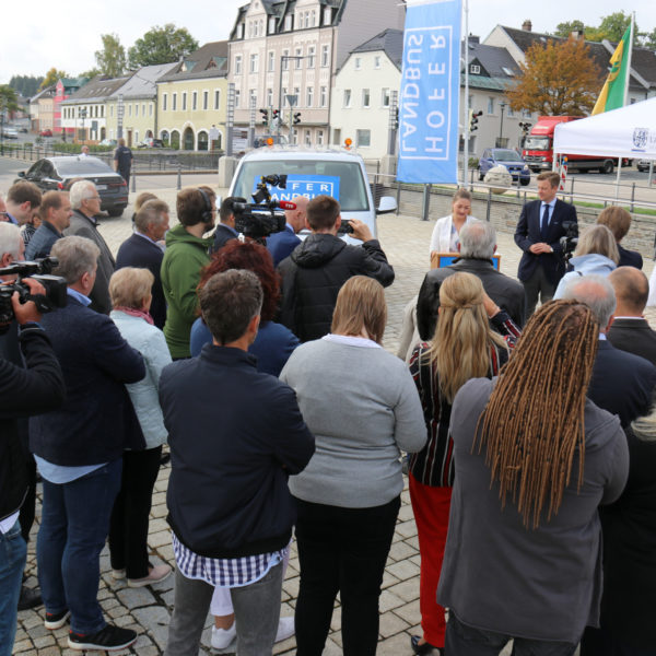 Am Vormittag hat Landrat Dr. Oliver Bär gemeinsam mit der Staatsministerin für Digitales, Judith Gerlach, in Rehau den Weg frei gegeben für den Hofer Landbus. Damit startet der Landkreis Hof ein neues Projekt, das den öffentlichen Nahverkehr in der Region deutlich verbessert.