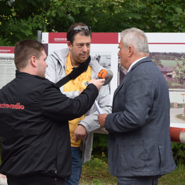 Im Bild (von links): Hermann Seiferth (Geschäftsleiter des Zweckverbandes Deutsch-Deutsches Museum Mödlareuth), Rolf Keil (Landrat des Vogtlandkreises), der Töpener Bürgermeister Klaus Grünzner, Museumsleiter Robert Lebegern und Thomas Fügmann (Landrat des Saale-Orla-Kreises) stellten das Programm anlässlich des 30. Jahrestages des Mauerfalls vor.