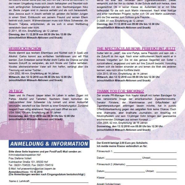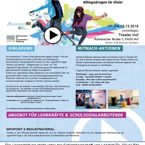 Die Jugendfilmtage umfassen Spielfilme und verschiedene Mitmach-Aktionen rund um die Themen Nikotin und Alkohol sowie einen Informationsstand für Lehrkräfte. Die Lehrkräfte erhalten dabei vor vor Ort methodische Anregungen zur Nachbereitung der Jugendfilmtage im Unterricht sowie kostenlose Broschüren und Infomaterialien. Insgesamt beteiligen sich zehn Schulen aus Stadt und Landkreis Hof mit rund 600 Schülerinnen und Schüler an der Veranstaltung.