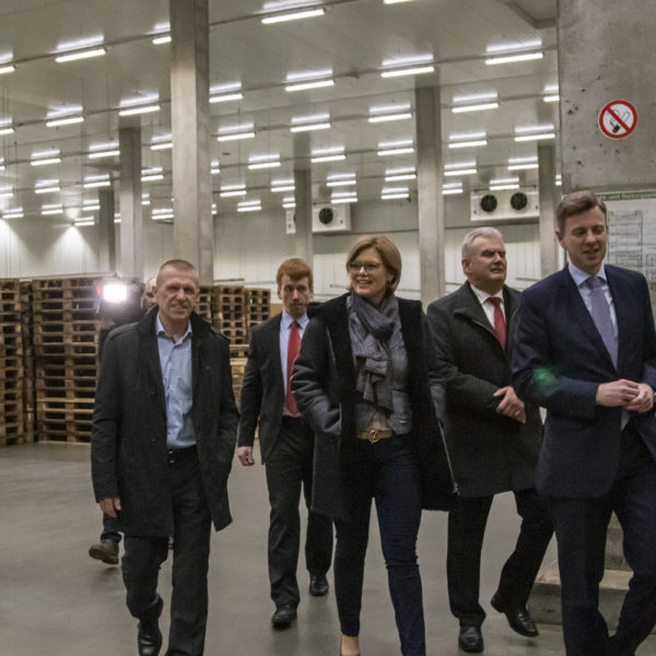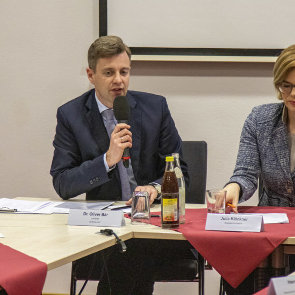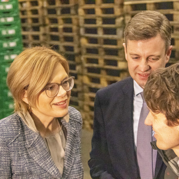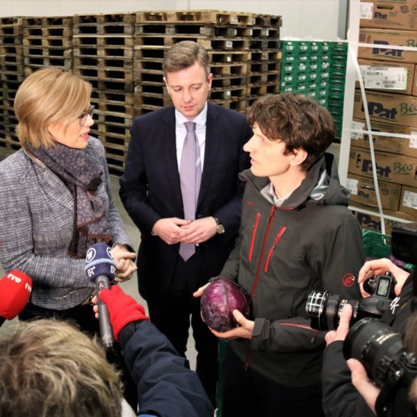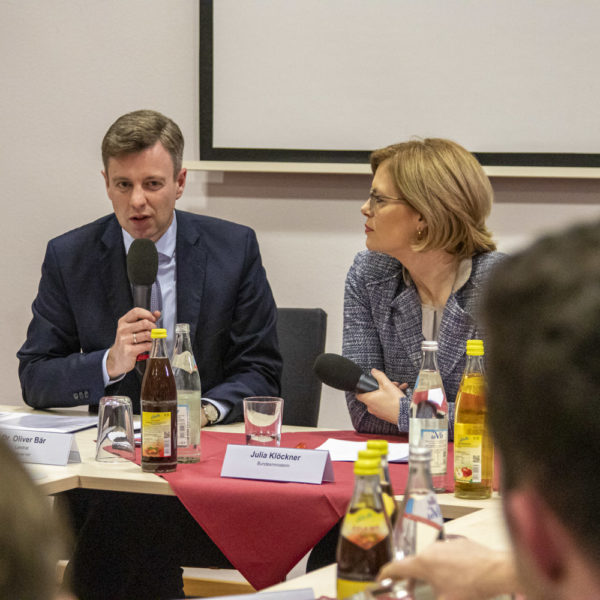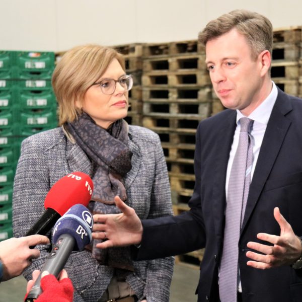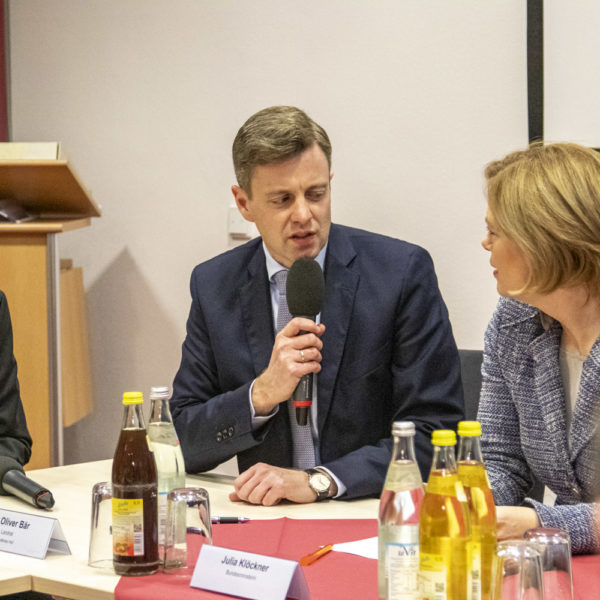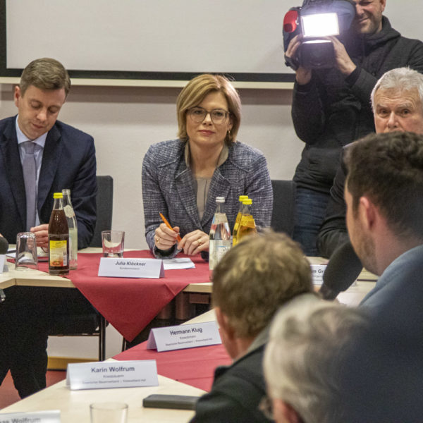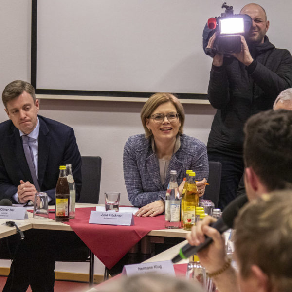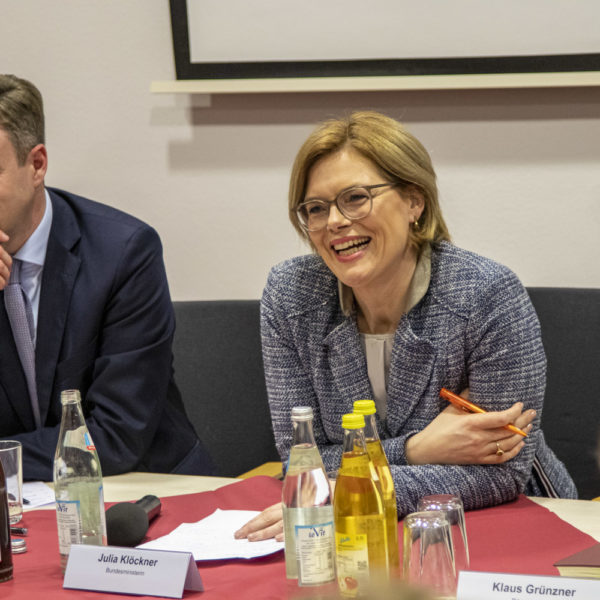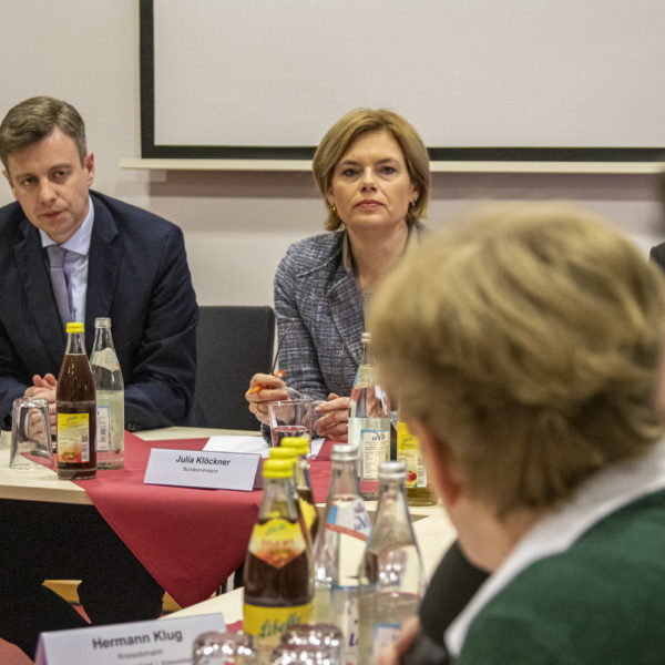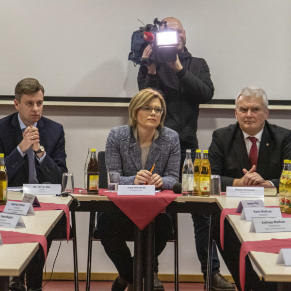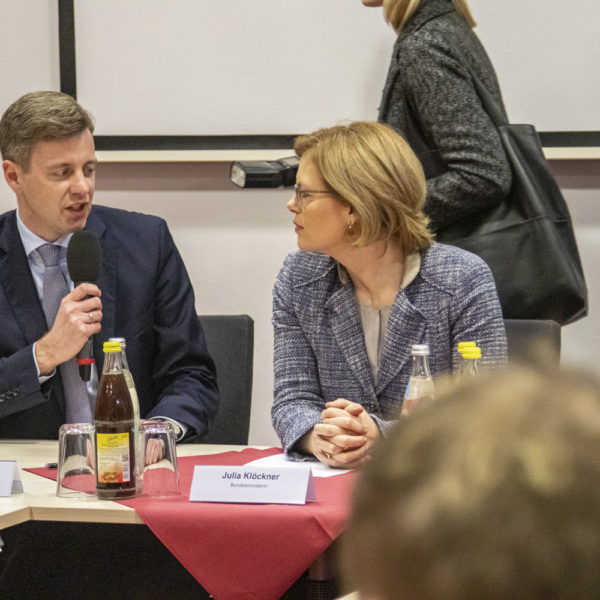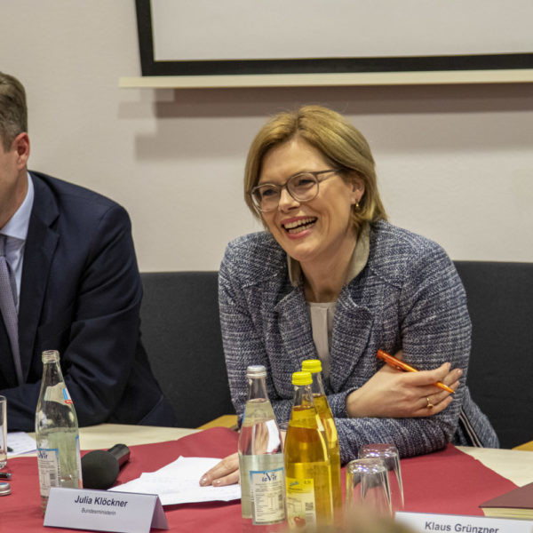 Bundeslandwirtschaftsministerin Julia Klöckner im Gespräch mit Lukas Nossol (Marketingleiter dennree) und Landrat Dr. Oliver Bär