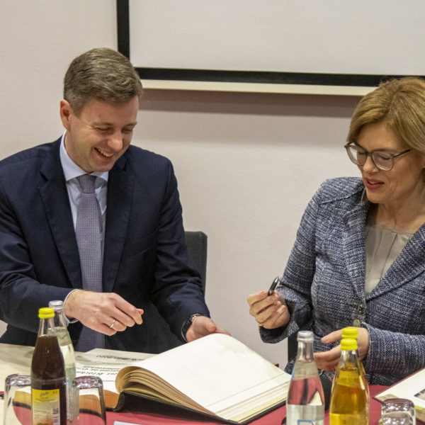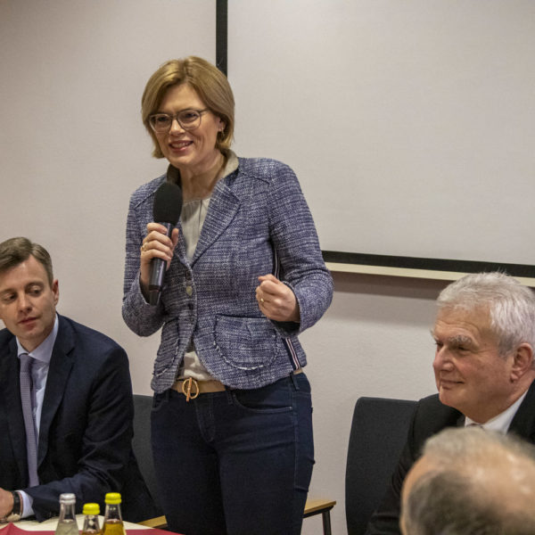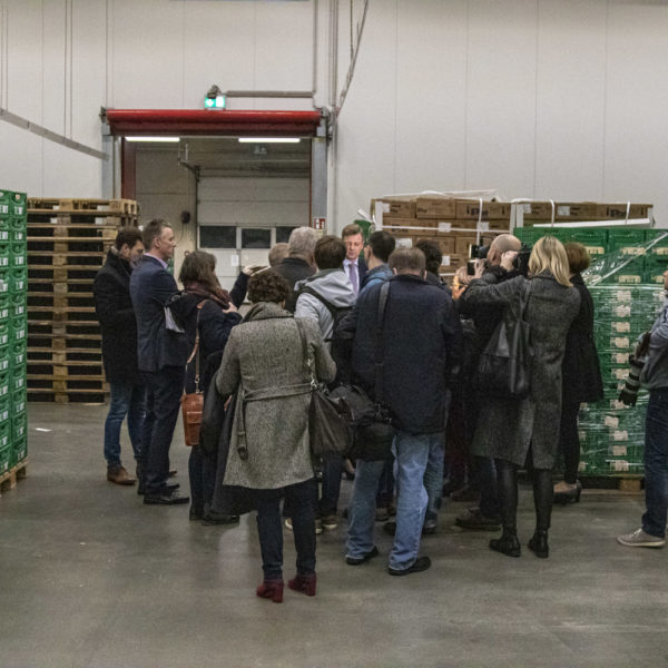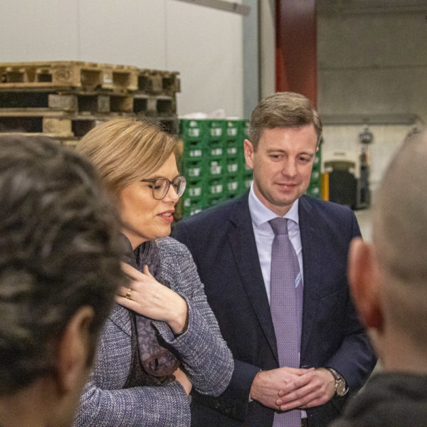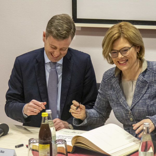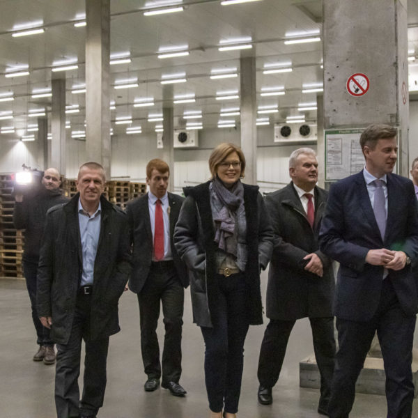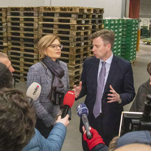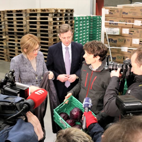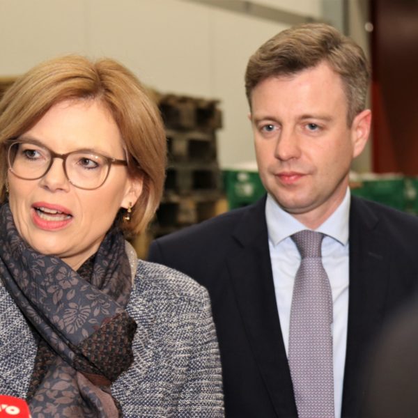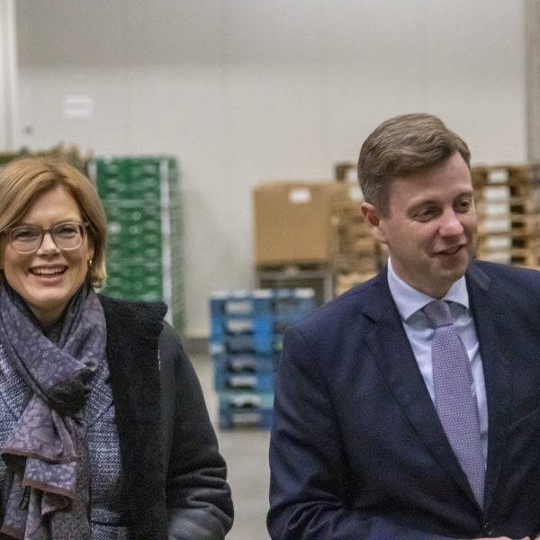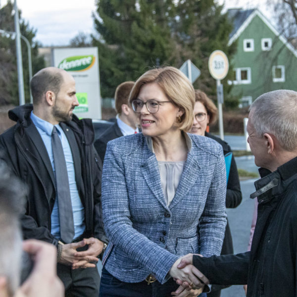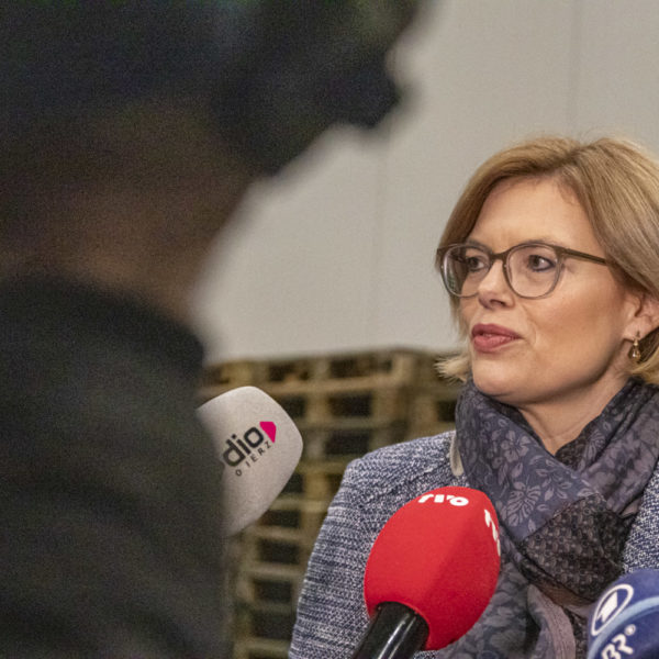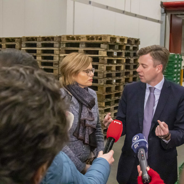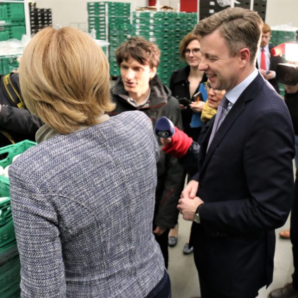 Bundeslandwirtschaftsministerin Julia Klöckner im Gespräch mit Lukas Nossol (Marketingleiter dennree) und Landrat Dr. Oliver Bär