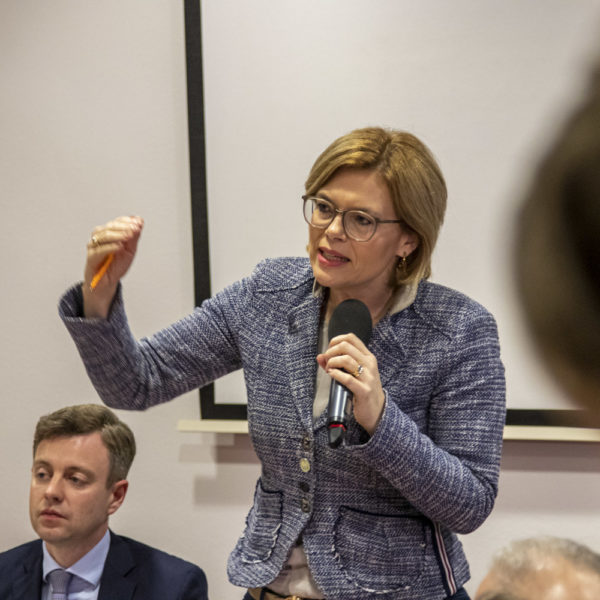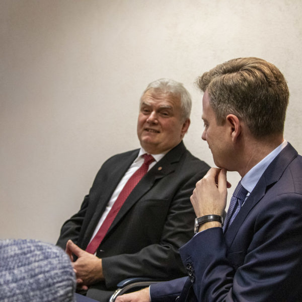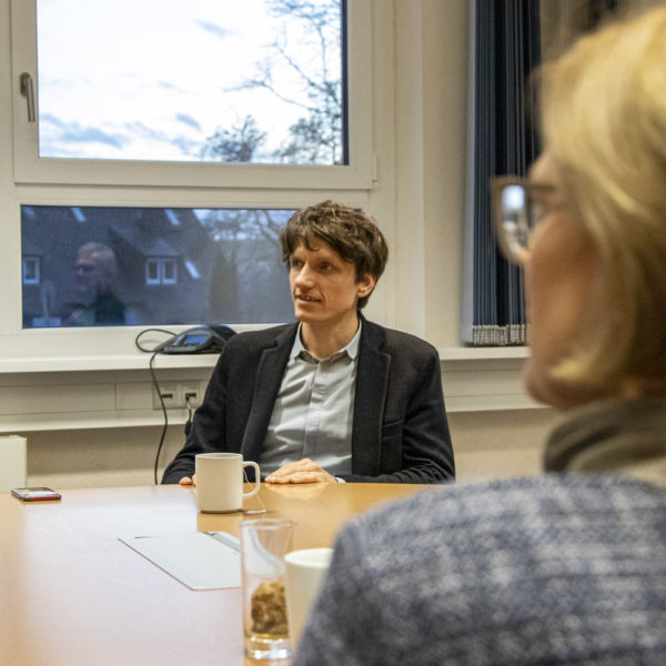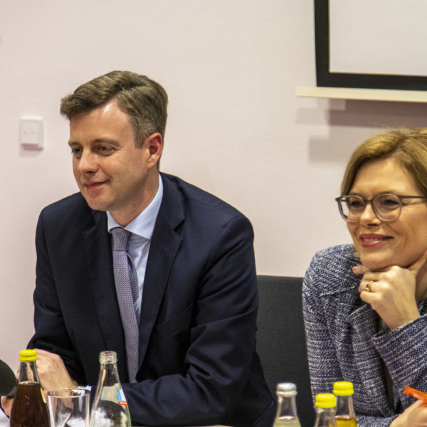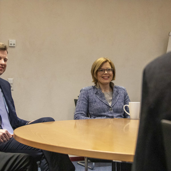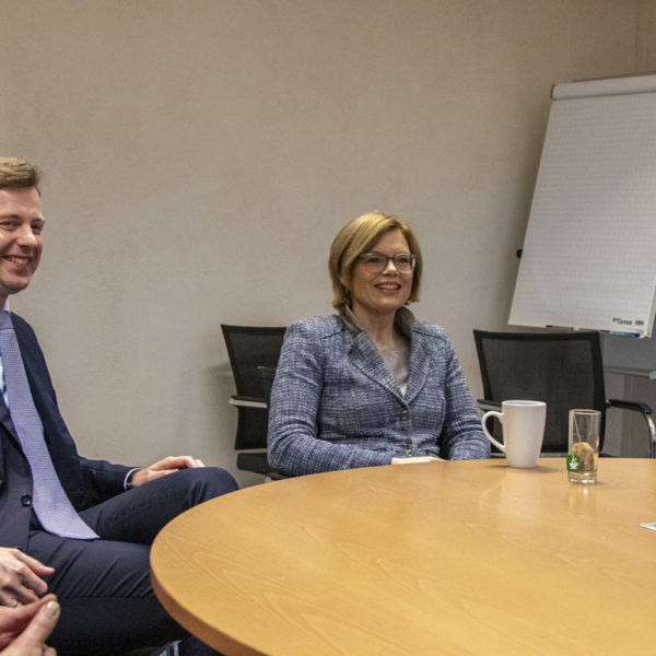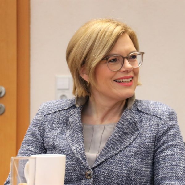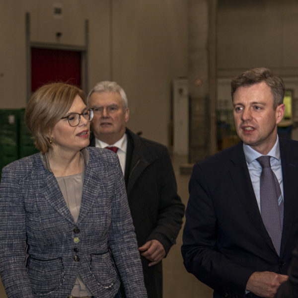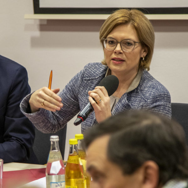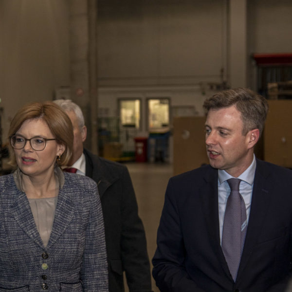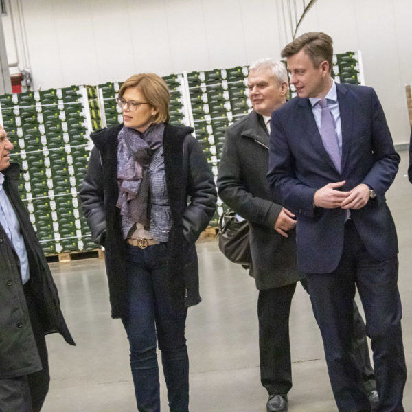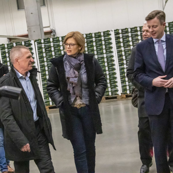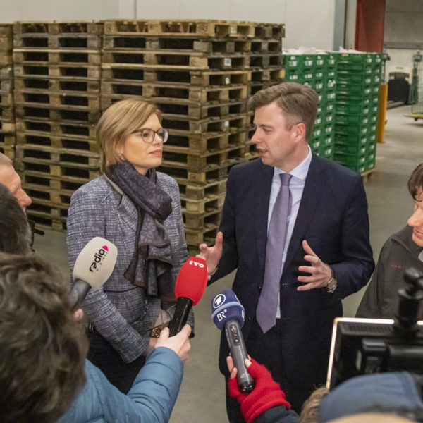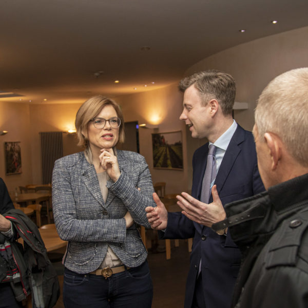 Bundeslandwirtschaftsministerin Julia Klöckner im Gespräch mit Lukas Nossol (Marketingleiter dennree) und Landrat Dr. Oliver Bär