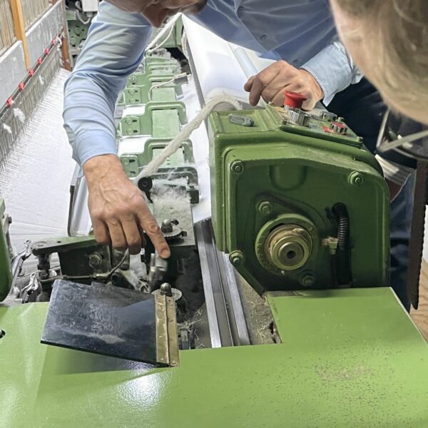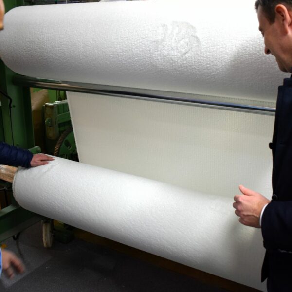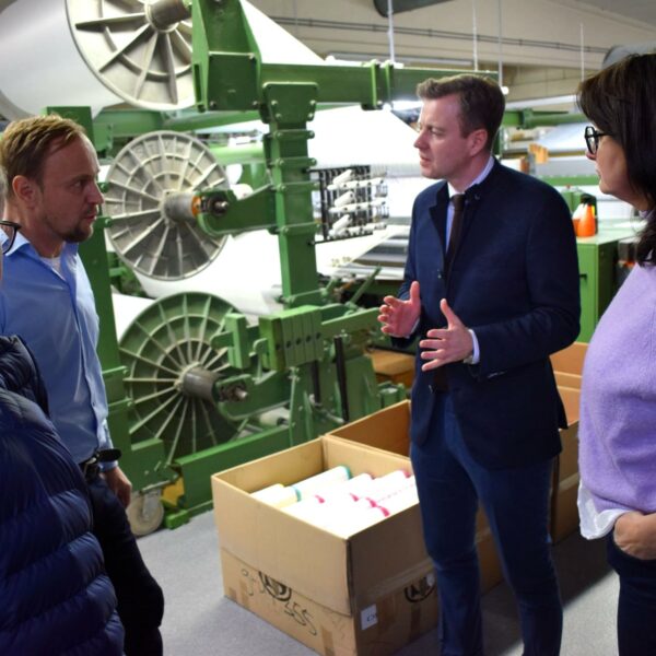 Nahe Stammbach, genauer im knapp 200 Einwohner zählenden Gundlitz, werden bereits seit mehr als 50 Jahren hochwertige Verloursgewebe produziert. Geschäftsführer Thomas Popp führte durch die Velours-Weberei, in der aktuell zehn Mitarbeiter u.a. technische Velouren für den Maschinenbau, biologische Baumwollplüsche für Spielwaren oder Artikel für den Reinigungssektor im professionellen und privaten Bereich herstellen. Landrat Dr. Oliver Bär bekam zudem Einblicke in die Funktionsweisen der 18 Doppelgreifer-Webmaschinen. Die Produktion befindet sich in der ehemaligen Stammbacher Veloursweberei, die Thomas Popp 2019 kaufte.