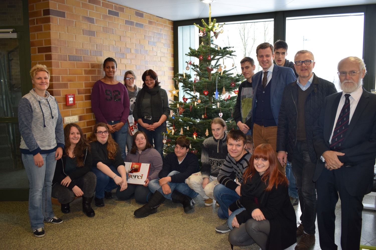 Das Bild zeigt die jungen Erwachsenen mit ihren Betreuerinnen und dem Vorsitzenden der Lebenshilfe Gerrit Giebermann (ganz rechts), Tagesstättenleiter Johannes Frisch (2.v.l) und Landrat Dr. Oliver Bär (4.v.r, stehend) vor dem Christbaum im Foyer des Landratsamtes.