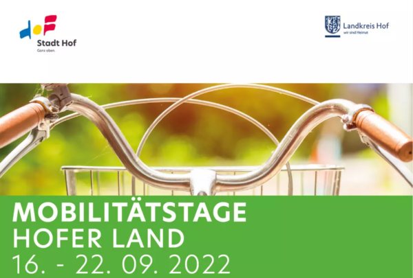 Bereits zum zweiten Mal veranstalten die Stadt und der Landkreis Hof die „Mobilitätstage Hofer Land“ im Rahmen der Europäischen Mobilitätswoche des Umweltbundesamtes, die jährlich vom 16. bis 22. September stattfindet. Im Mittelpunkt stehen dezentrale Veranstaltungen für alle Bürgerinnen und Bürger, die sich über klima- und umweltfreundliche Formen der Fortbewegung informieren und diese auch selbst ausprobieren möchten. Das Programm der „Mobilitätstage Hofer Land“ findet an verschiedenen Orten und Einrichtungen in der Stadt Hof und im Landkreis statt.